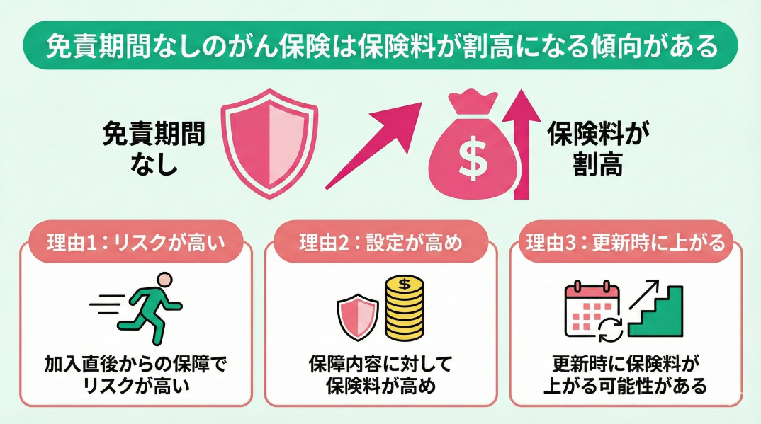 免責期間なしのがん保険は、加入者がすぐに保障を受けられる反面、保険会社にとってはリスクが高くなるため、保険料が割高に設定されることがあります。
