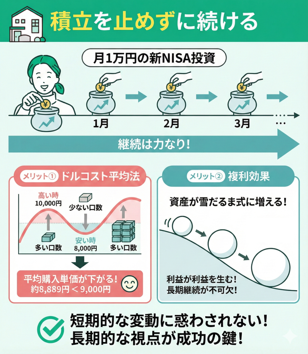 月1万円の新NISA投資で最も重要なのは、積立を止めずに継続することです。