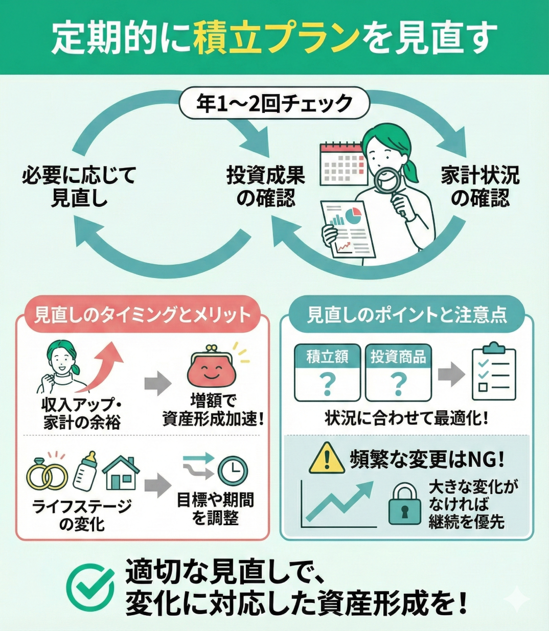年に1~2回程度、家計の状況と投資成果を確認し、必要に応じて積立額や投資商品の見直しを行いましょう。