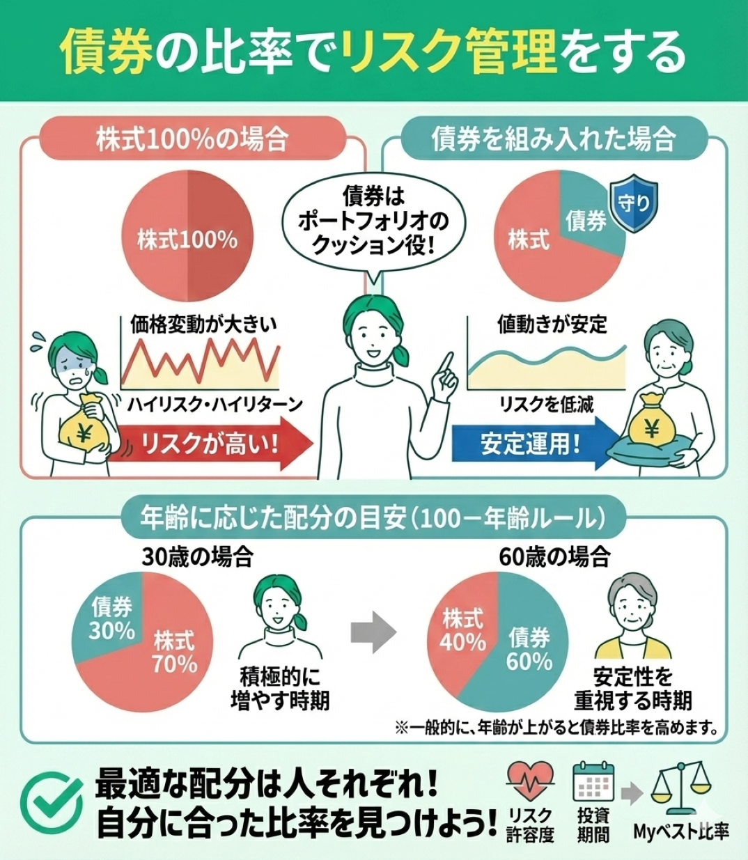 一般的に、年齢に応じて債券比率を調整する「100マイナス年齢」ルールがあり、30歳なら株式70%・債券30%といった配分が推奨されます。