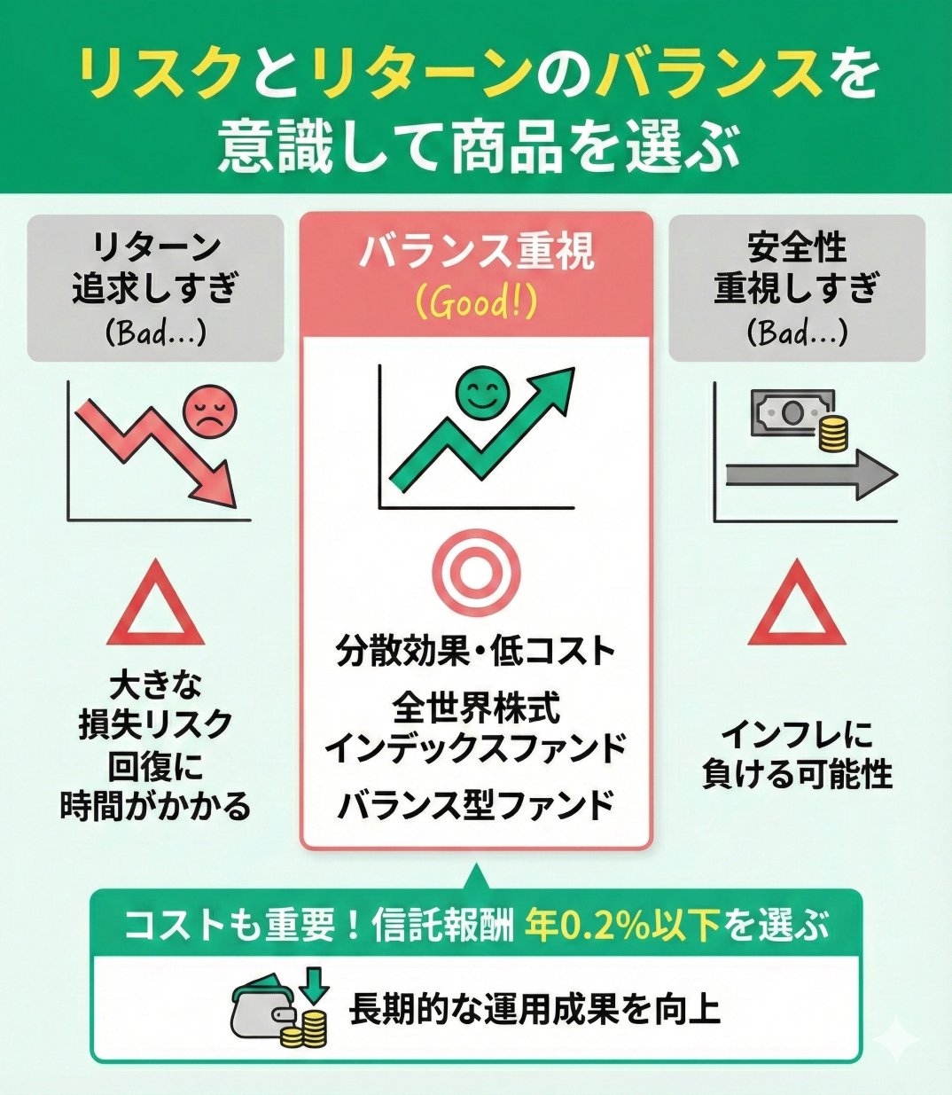 - リスクとリターンのバランスを意識して商品を選ぶ