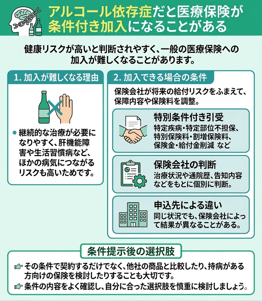 アルコール依存症がある場合、一般の医療保険は加入が難しくなることがあります。 ただし、治療状況や告知内容によっては、通常の医療保険に加入できる可能性があり、難しい場合でも条件付き加入や引受基準緩和型保険などを検討できることがあります。
