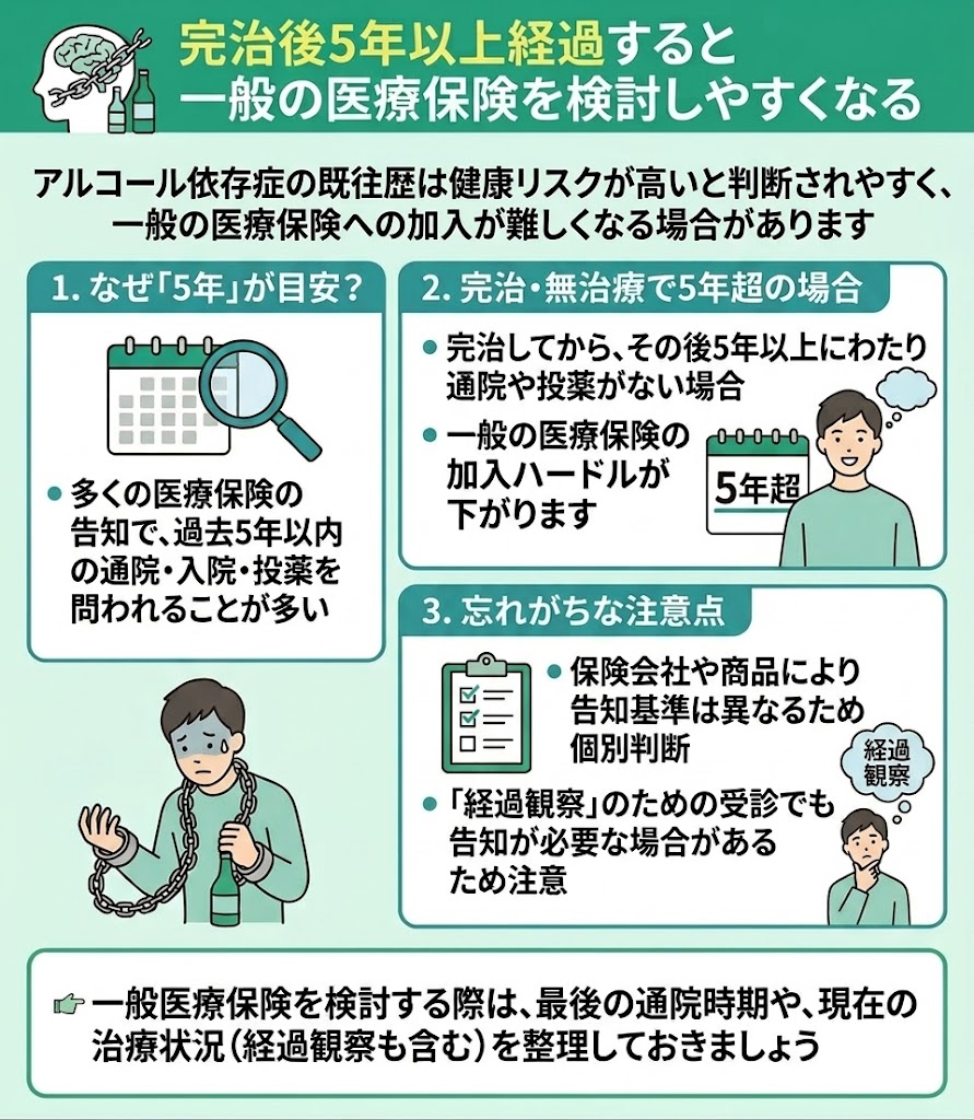 多くの医療保険では、告知の際に過去5年以内の通院歴や入院歴、投薬歴などを確認されます。 そのため、完治後5年以上にわたってアルコール依存症で受診していなければ、一般の医療保険を検討しやすくなります。