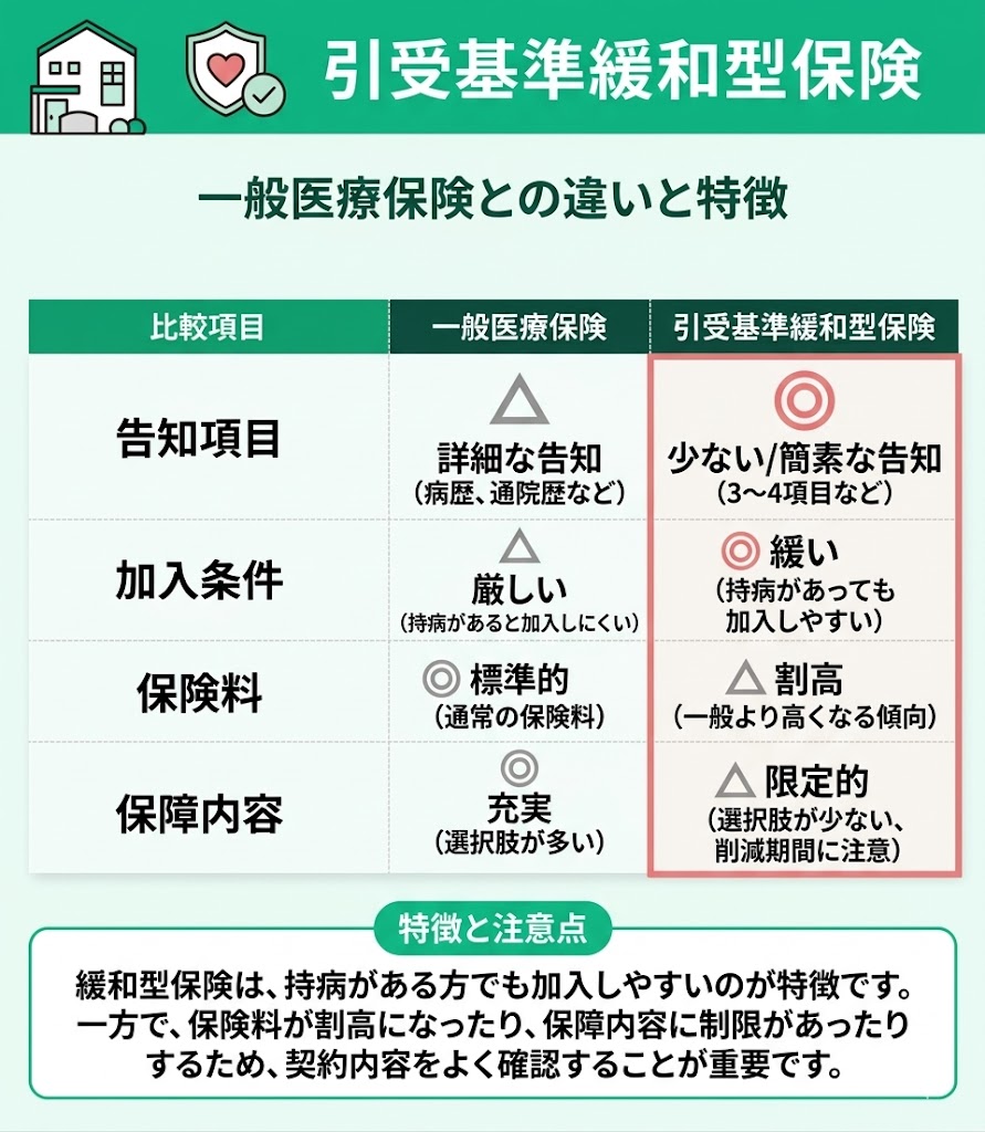 引受基準緩和型保険は、一般の医療保険に比べて告知項目が少なく、加入条件も緩やかに設定されている保険です。 そのため、持病がある方や、一般の医療保険では加入が難しい方でも検討しやすいのが特徴です。