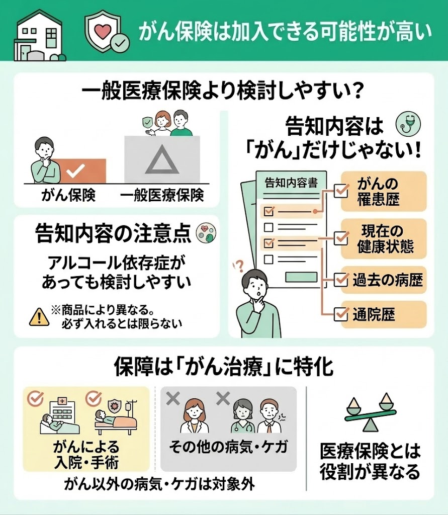アルコール依存症がある場合でも、がん保険は一般の医療保険より検討しやすいことがあります。 ただし、加入できるかどうかは商品ごとの告知項目や引受基準によって異なるため、「必ず入れる」とは言い切れません。