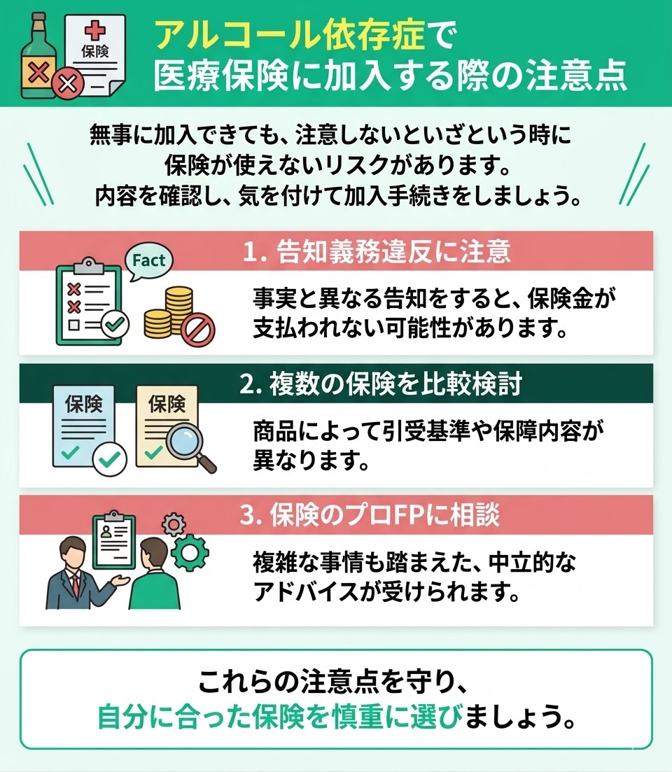 アルコール依存症で医療保険に加入する際の3つの注意点はこちらです。