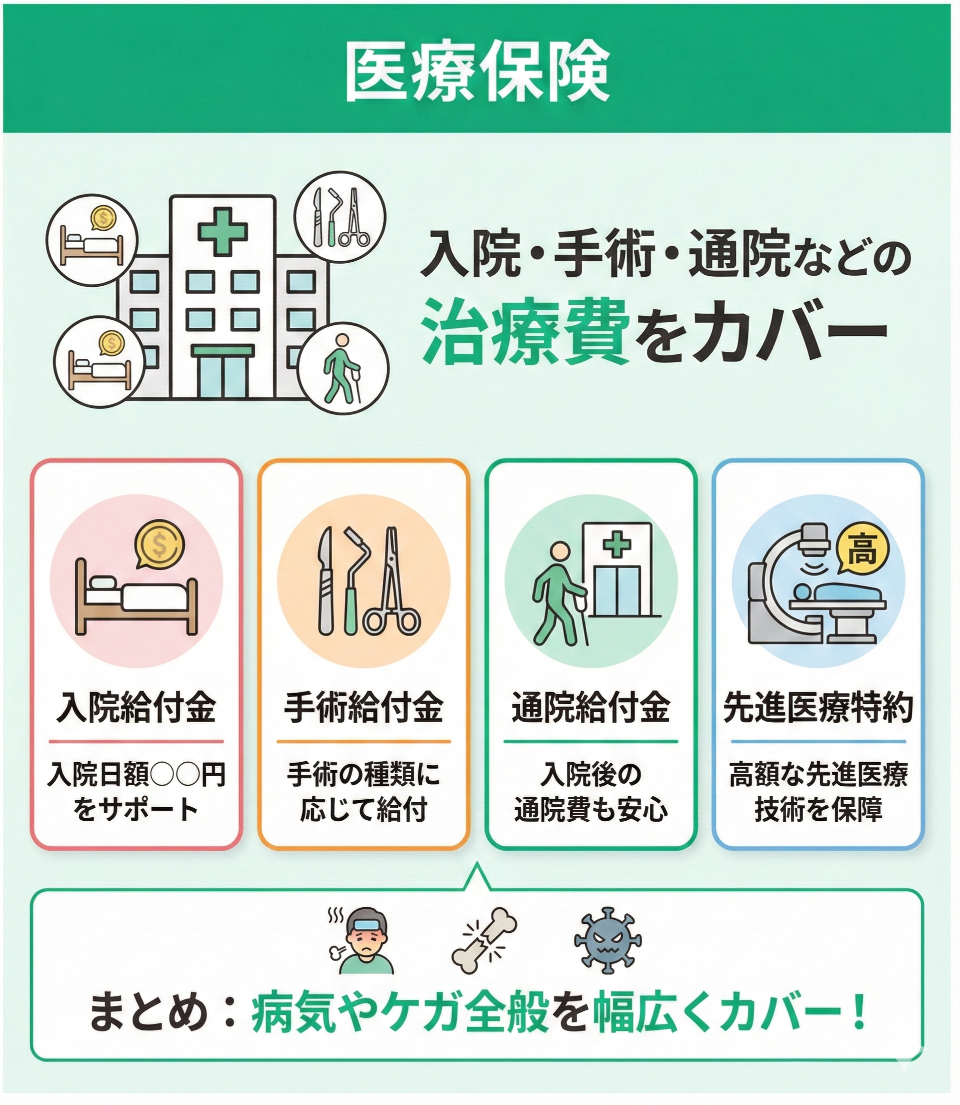 医療保険は入院や手術、通院などの治療費をカバーする保険です。