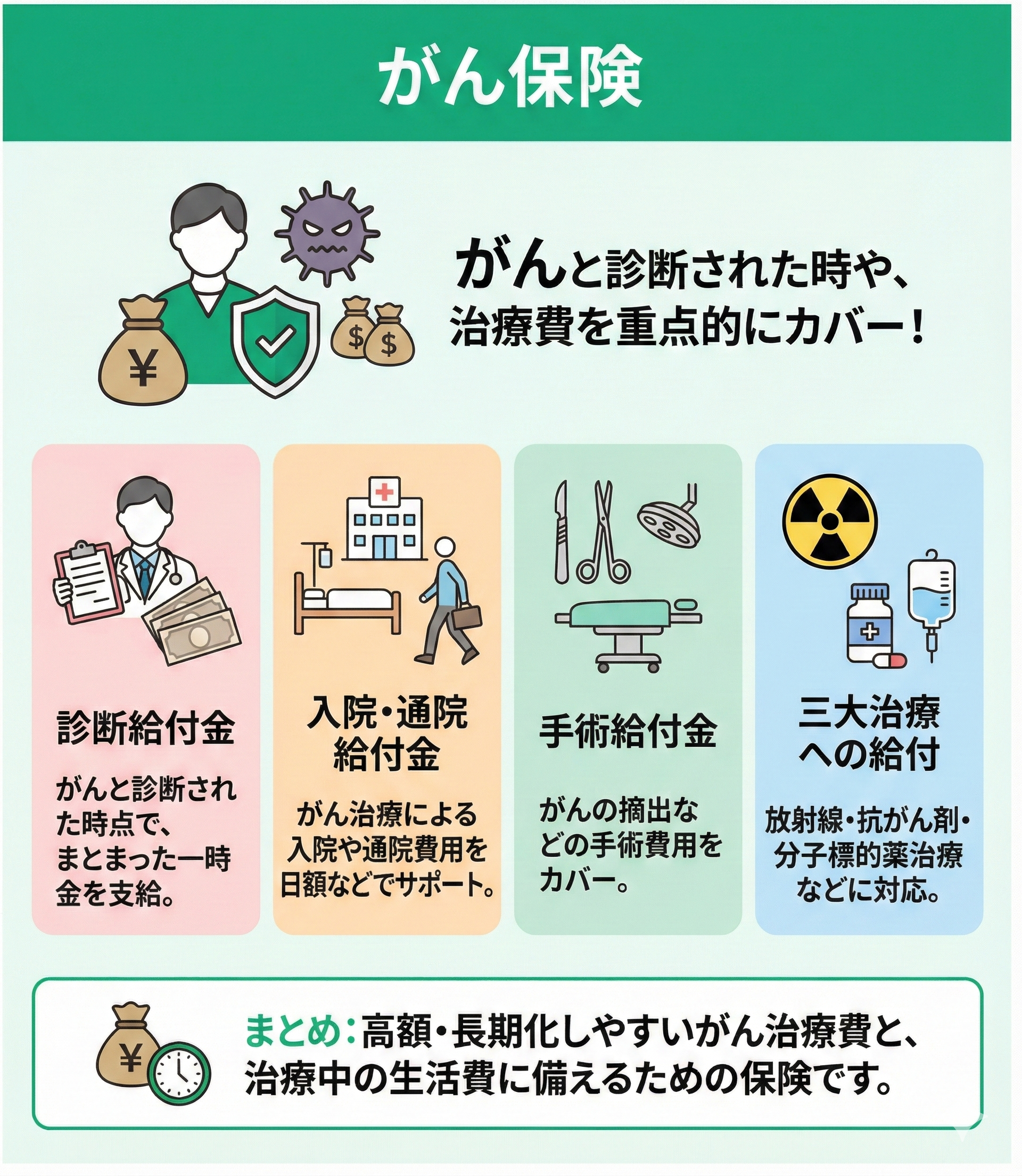 がん保険は、がんと診断されたときや、がん治療費を重点的にカバーする保険です。