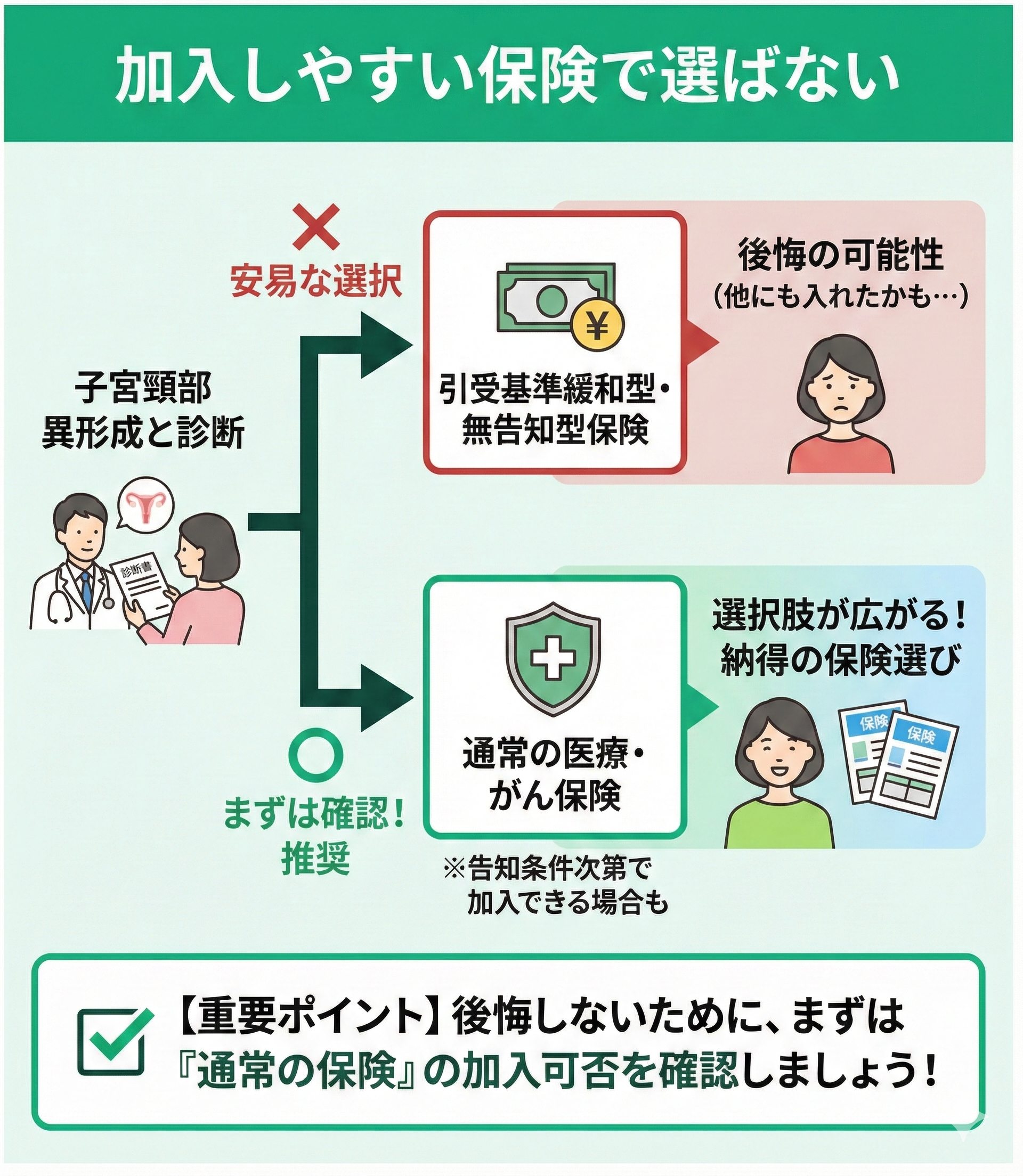 ただし、告知内容によっては、子宮頸部異形成であっても通常の医療保険やがん保険に加入できるケースもあります。そのため、いきなり緩和型保険に絞るのではなく、まずは通常の保険で加入可能かどうかを丁寧に確認することが大切です。