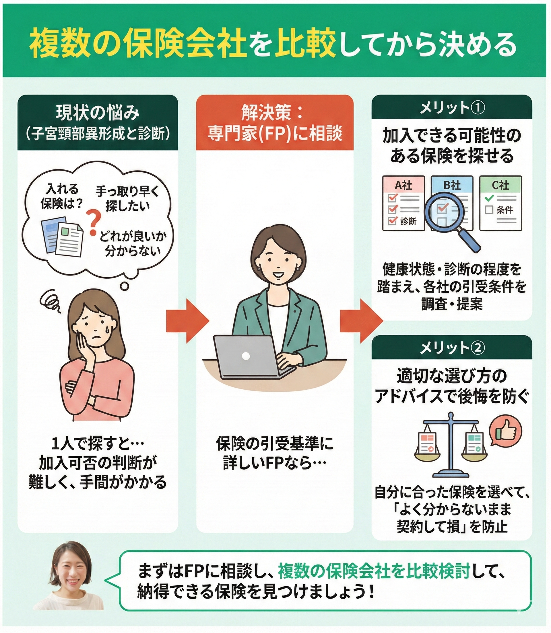 子宮頸部異形成と診断され、「とにかく加入できる保険を知りたい」「どの保険なら申し込み可能なのか判断できない」と感じている場合は、引受基準に精通した専門家(FP)へ相談することを強くおすすめします。