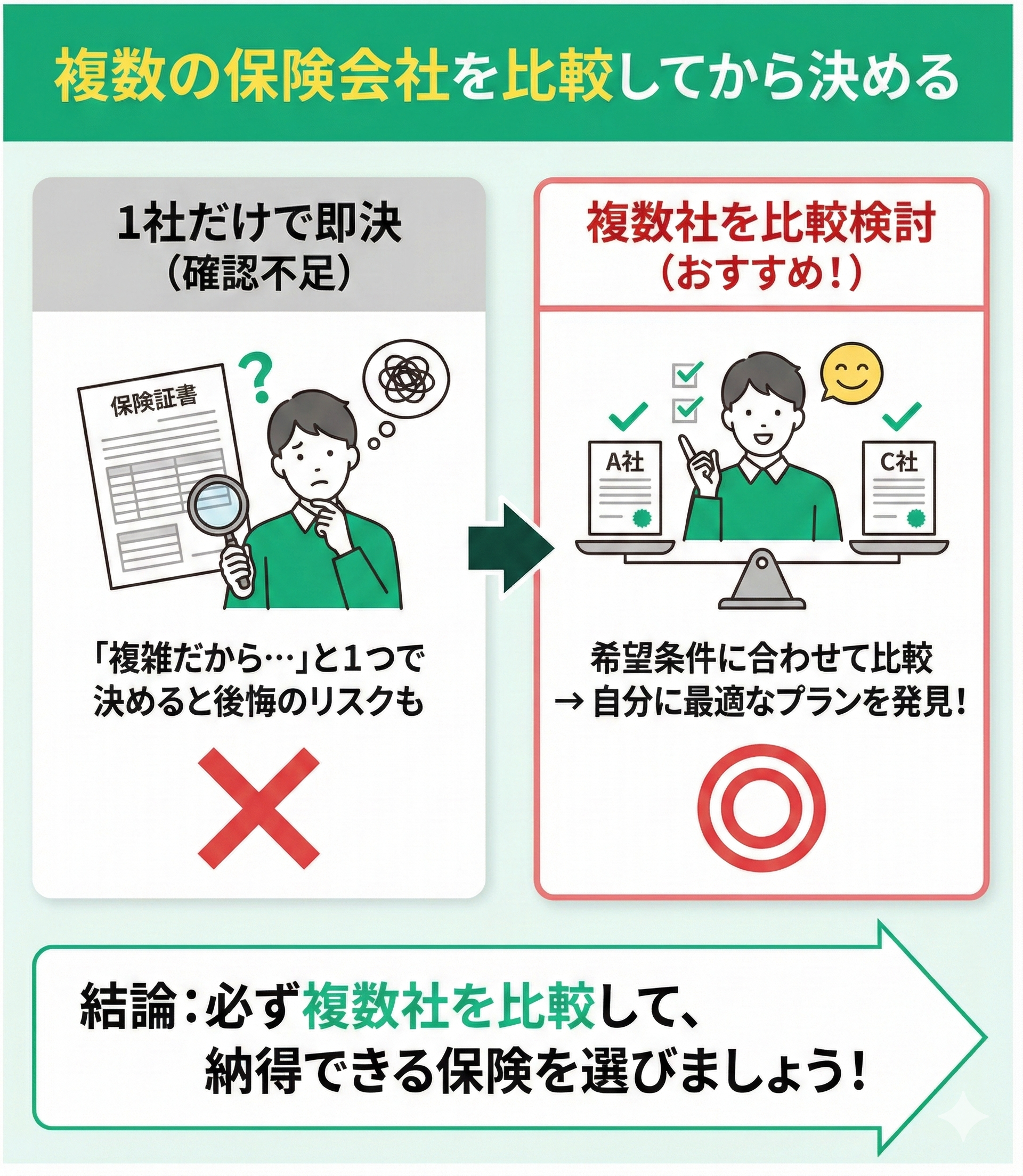 保険は仕組みが複雑なため、「よくわからないから」と最初に見た1つだけで判断してしまうと、後から他にもっと自分に合った選択肢があったと気づき、後悔につながるケースもあります。