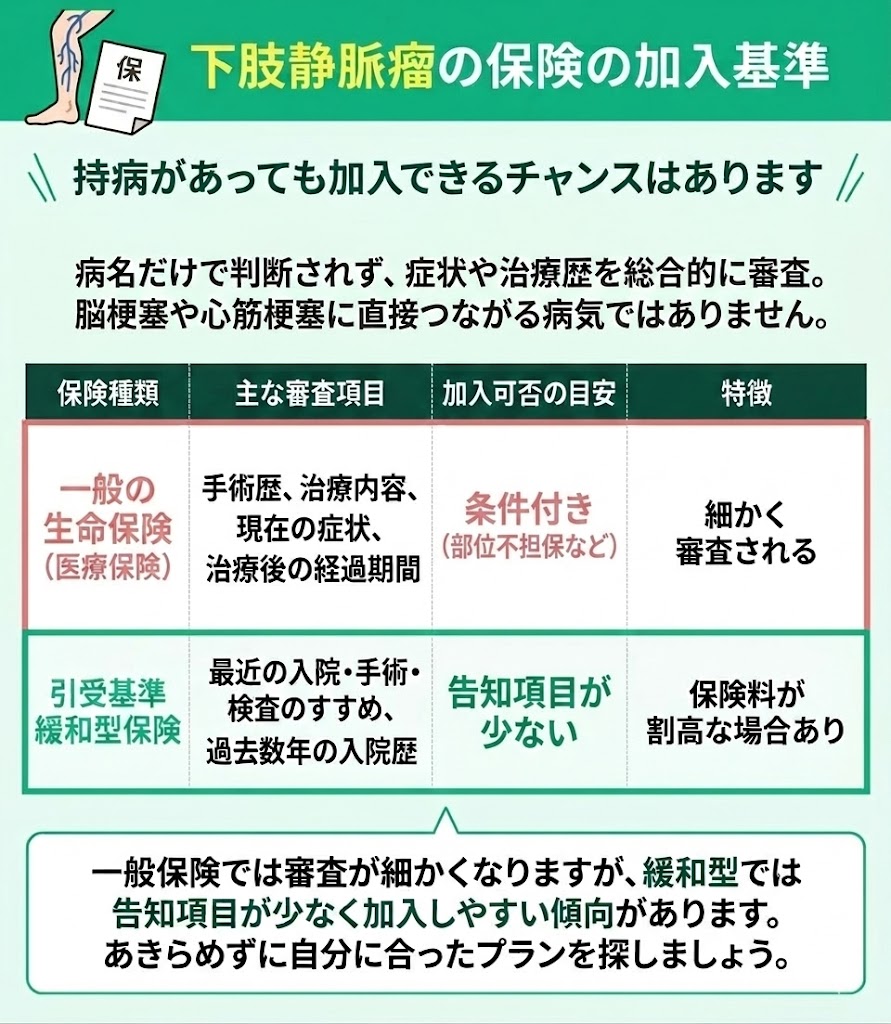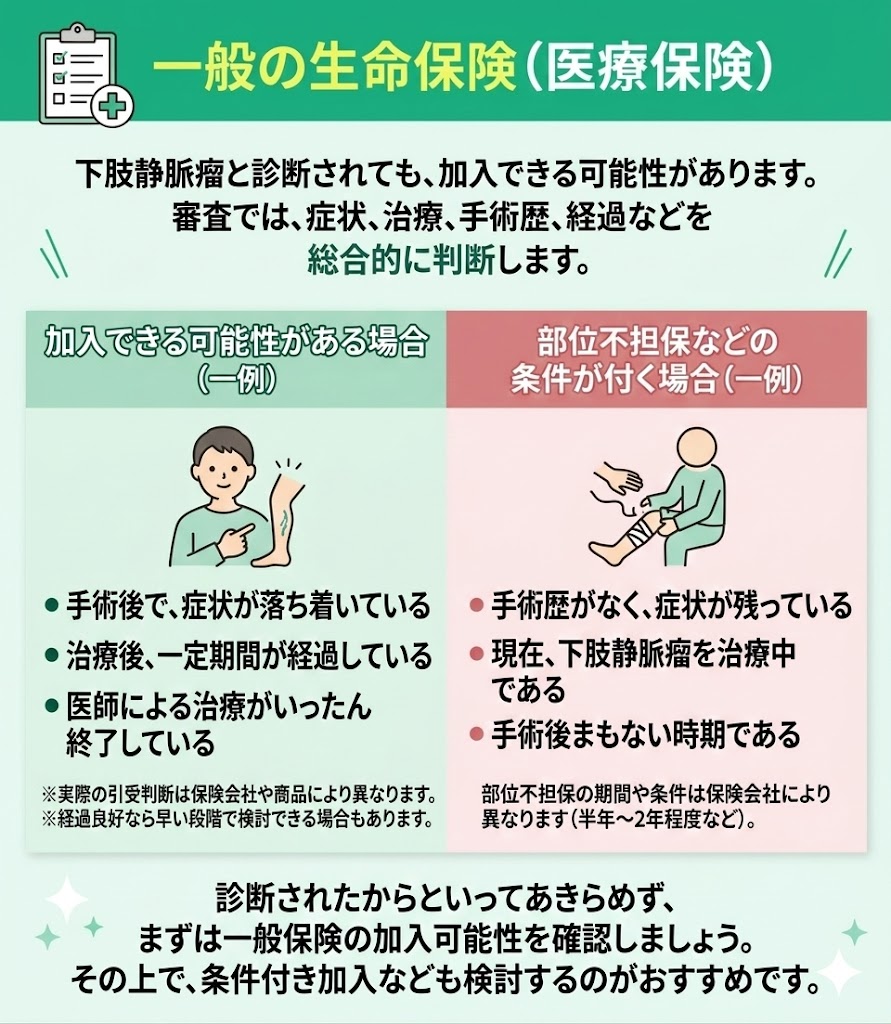 ここでは、下肢静脈瘤と診断された方が一般の生命保険(医療保険)に加入できる可能性があるケースと、部位不担保などの条件が付くケースについて解説します。