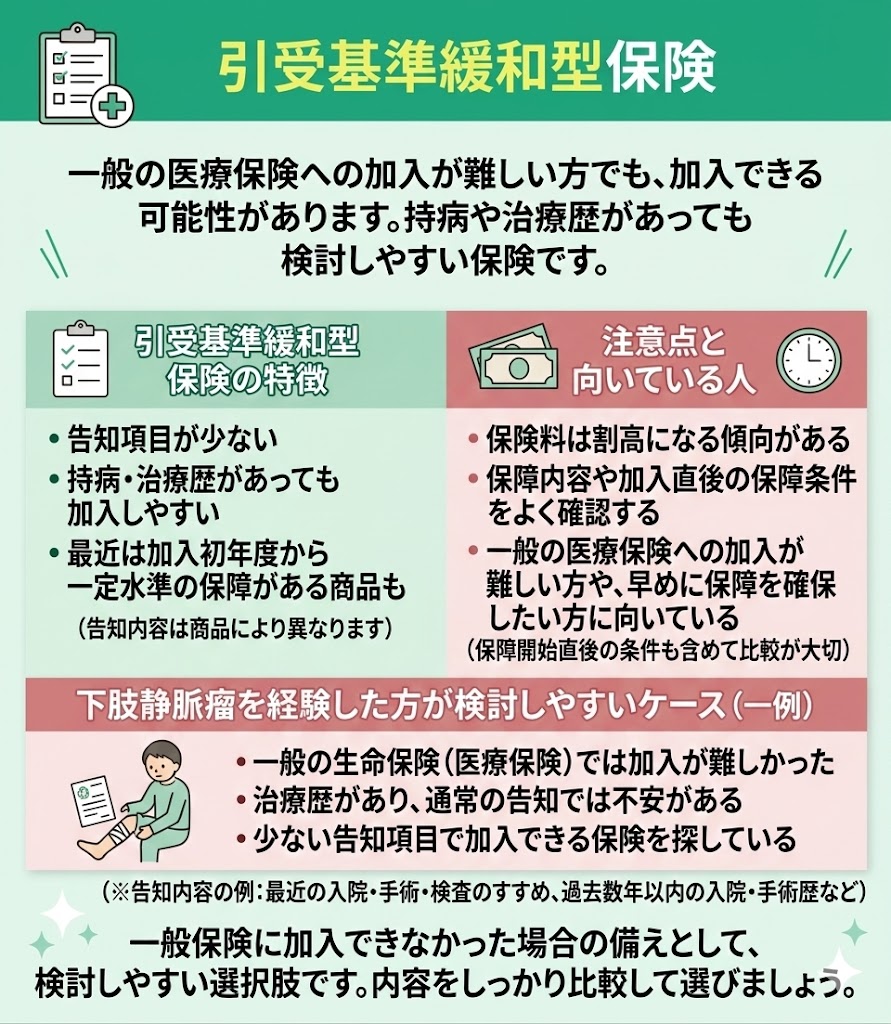 そのため、「下肢静脈瘤でも入れる」と案内された保険が、必ずしも最適とは限りません。現在の症状や治療歴によっては、一般の生命保険(医療保険)や条件付き加入を検討できる場合もあります。