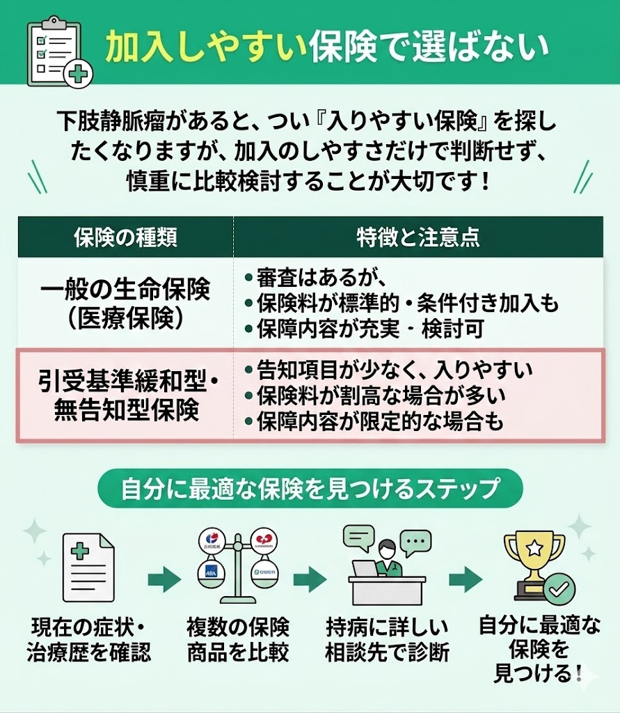 下肢静脈瘤があると、できるだけ入りやすい保険を選びたくなるかもしれません。 しかし、保険選びで大切なのは、加入しやすさだけで決めないことです。