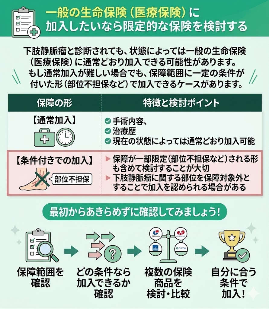 たとえば、下肢静脈瘤に関する部位を不担保とすることで、加入を認められる場合があります。 そのため、一般の生命保険(医療保険)に入りたい場合は、保障が一部限定される形も含めて検討することが大切です。