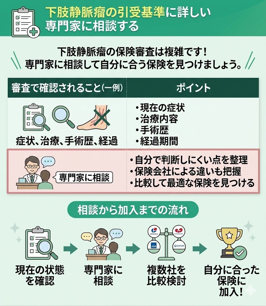 下肢静脈瘤の引受基準に詳しい専門家に相談する