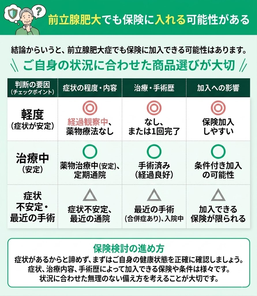 前立腺肥大でも保険に加入できる可能性はありますが、加入しやすさや条件の有無は人によって異なります。