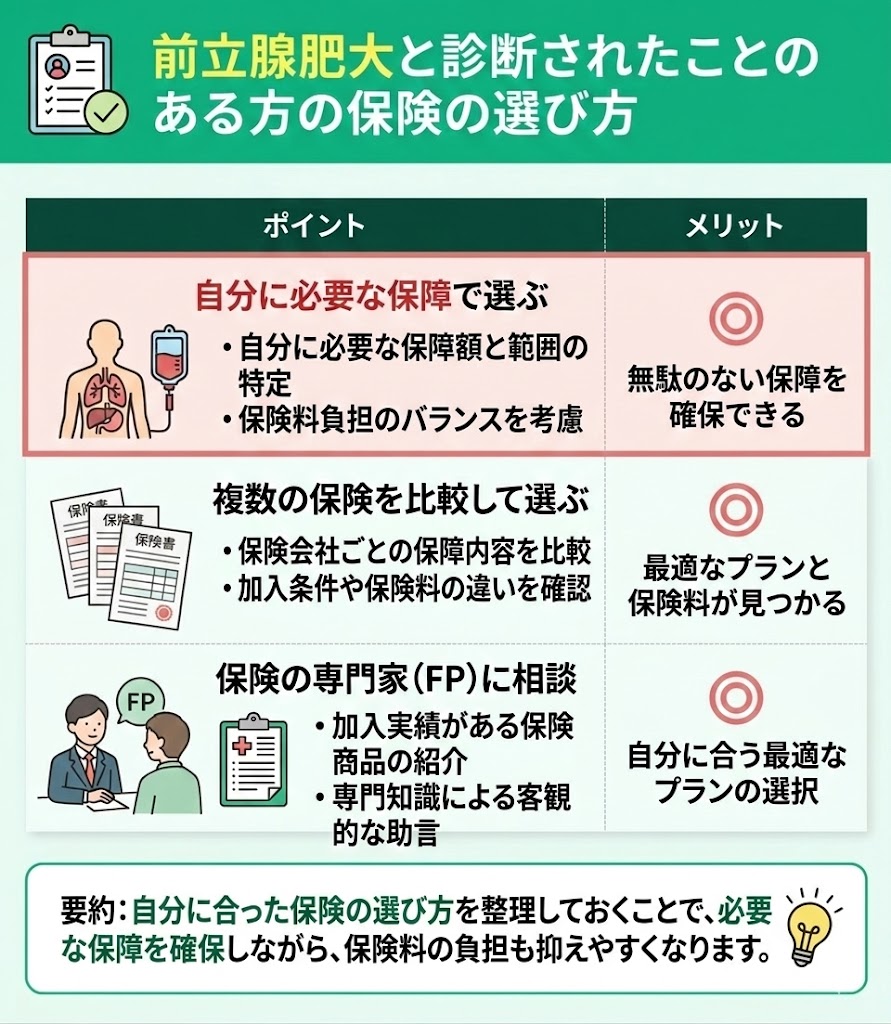 前立腺肥大と診断されたことがある場合は、加入できるかどうかだけでなく、自分に合った保険をどう選ぶかも重要です。