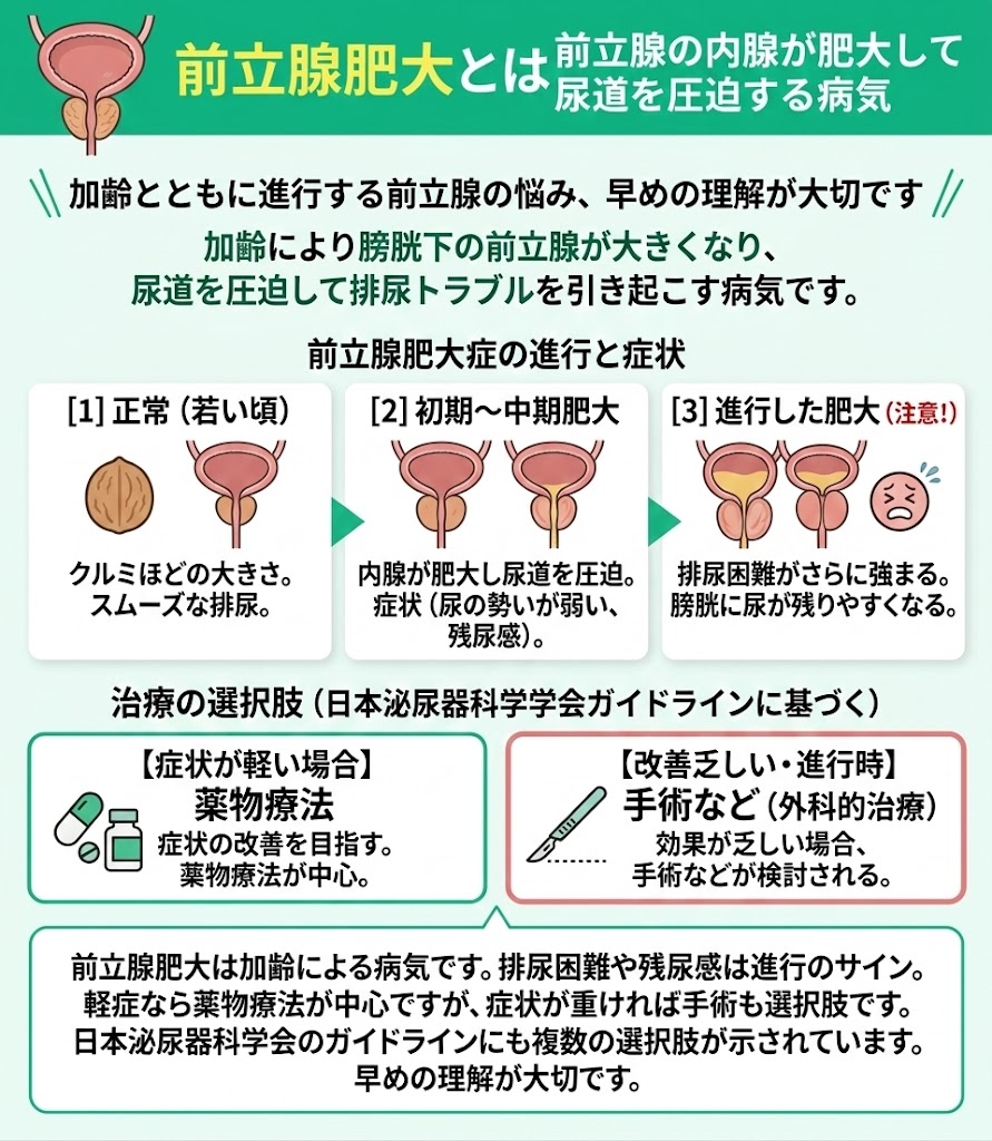 前立腺肥大とは、加齢に伴って前立腺が大きくなり、尿道を圧迫して尿が出にくくなる病気です。前立腺は膀胱のすぐ下で尿道を取り囲んでおり、大きくなると尿の勢いが弱くなったり、残尿感が出たりすることがあります。