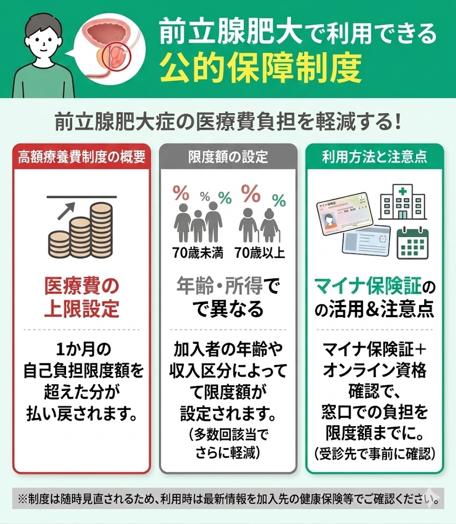 - 前立腺肥大の治療では、高額療養費制度などの公的保障制度を利用できる場合がある