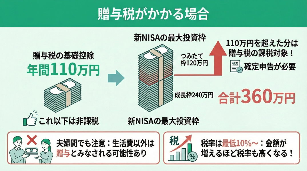 妻名義のNISA口座で利用する資金を夫が用意する場合でも、年間110万円までは贈与税がかかりません。