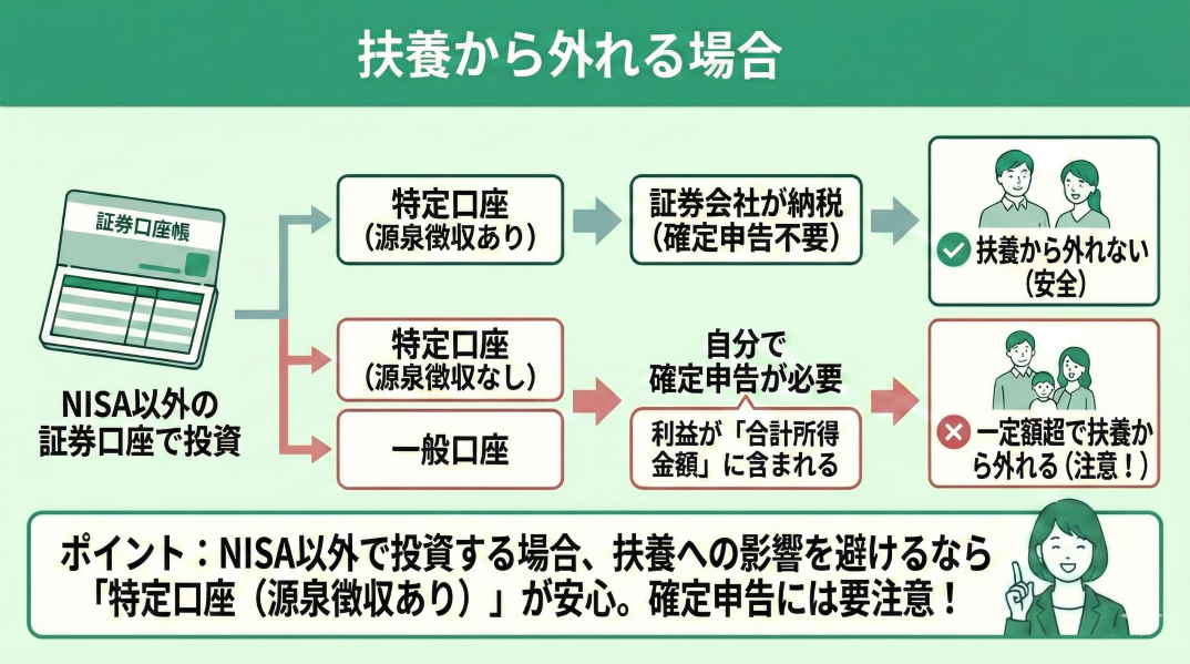 「特定口座(源泉徴収あり)」は、証券会社が利益から税金を源泉徴収してくれるため、確定申告の必要がなく、扶養から外れる心配もありません。
