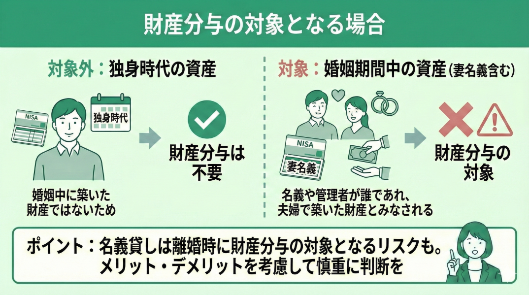 独身中に積立NISAを運用していた場合は、婚姻生活の中で夫婦間で資産を運用したとは言えないので、財産分与が不要になるケースが多いです。