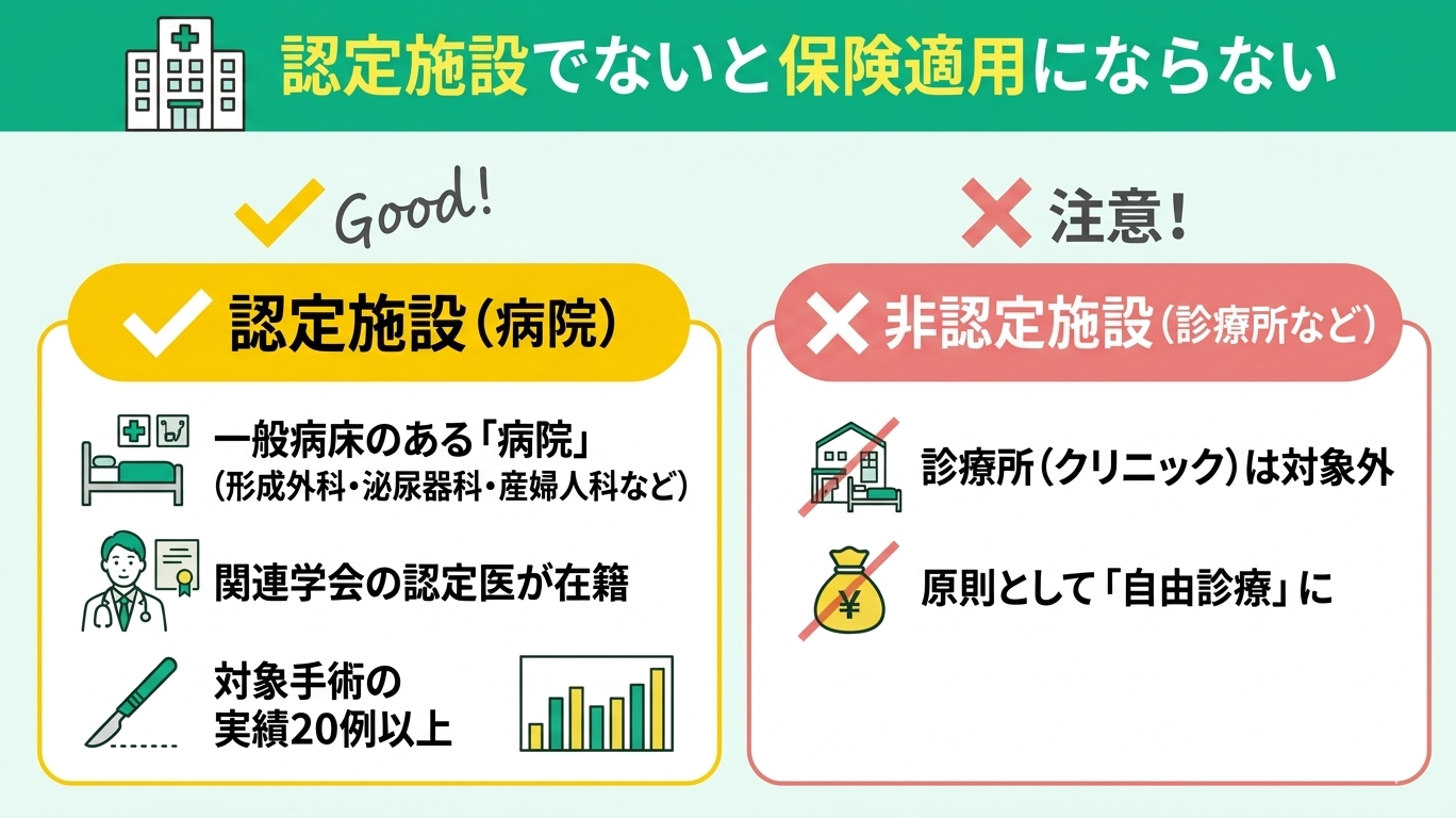 性別適合手術を健康保険で受けるためには、厚生労働省が定める施設基準を満たした「認定施設」での手術が必要です。基準を満たさない医療機関で手術を受けると、原則として自由診療となるため注意しましょう。