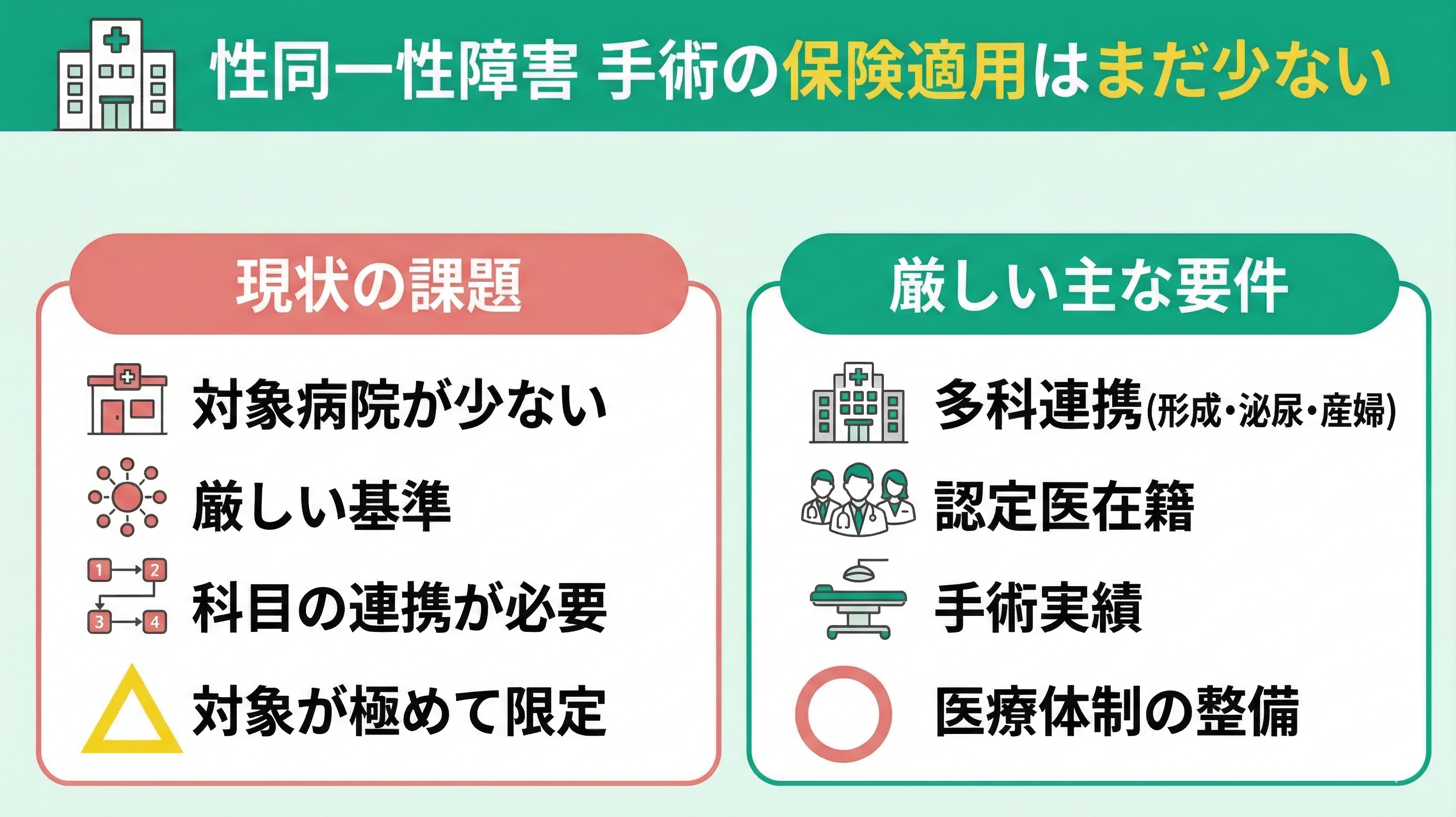 性同一性障害(GID)の性別適合手術は健康保険の対象ですが、施設基準や医師要件が厳しく、保険適用で手術を受けられる件数はまだ多くありません。主な理由は、保険診療を行える医療機関が限られているためです。