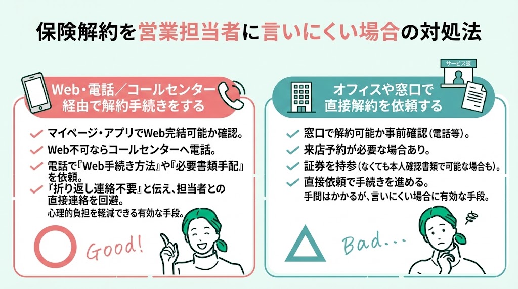 担当者に直接言いにくい方にとって、Web(マイページ等)・電話/コールセンター経由の手続きは、心理的負担を減らしながら解約を進められる有効な手段です。