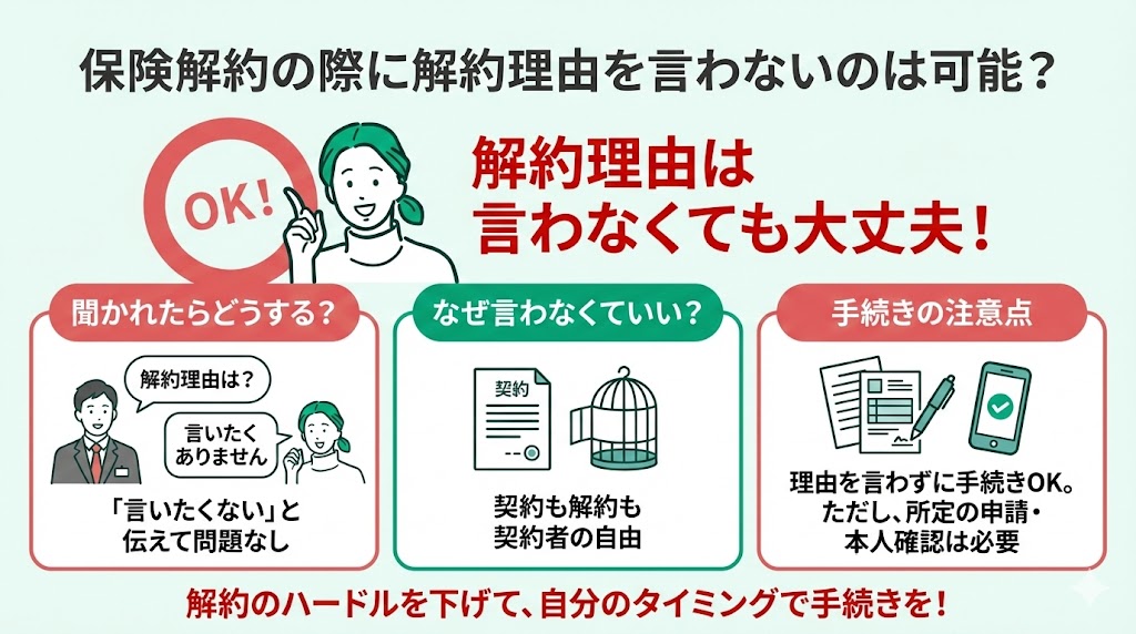 解約したいタイミングで、理由を伝えずに手続きを進めて大丈夫です。ただし、実際の解約手続きには所定の申請や本人確認が必要になるため、保険会社の案内に沿って進めましょう。