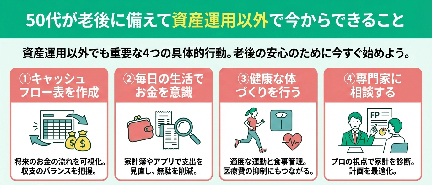 老後に備えるために、資産運用以外でも今からできる具体的な行動があります。以下にそれらを紹介します。