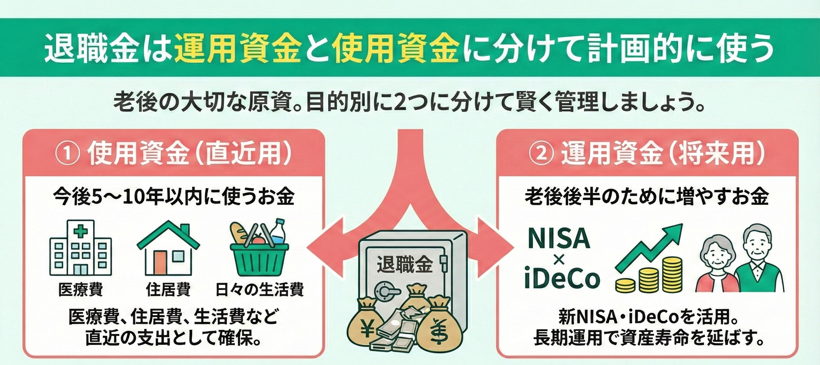 - 退職金は運用資金と使用資金に分けて計画的に使う