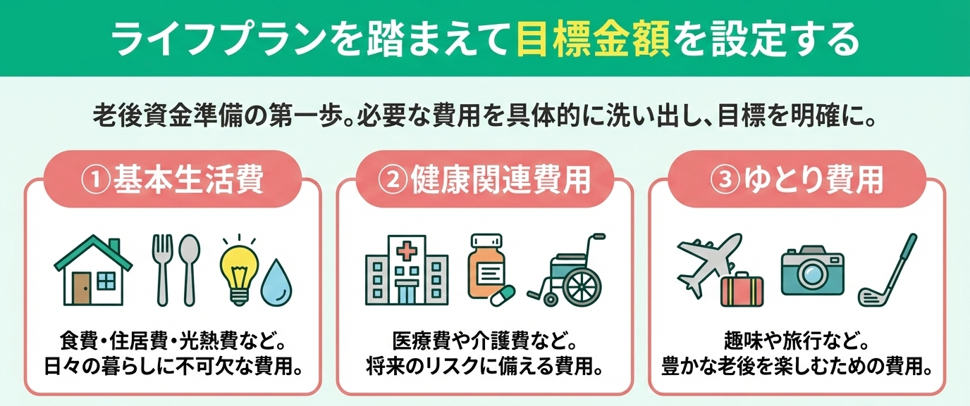 老後資金を準備するうえで、ライフプランに基づいた目標金額と期間の設定は欠かせません。