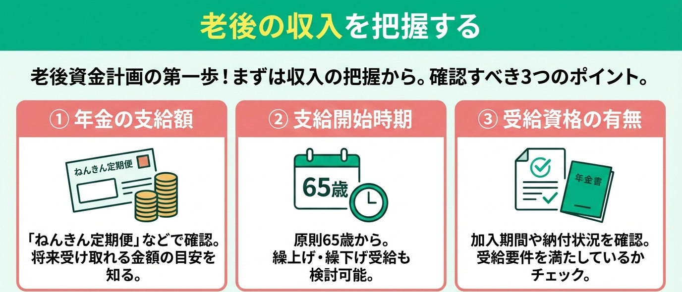 老後の資金計画を立てるには、まずどれだけ収入があるかの把握が基本となり、確認すべきポイントは以下の3つです。