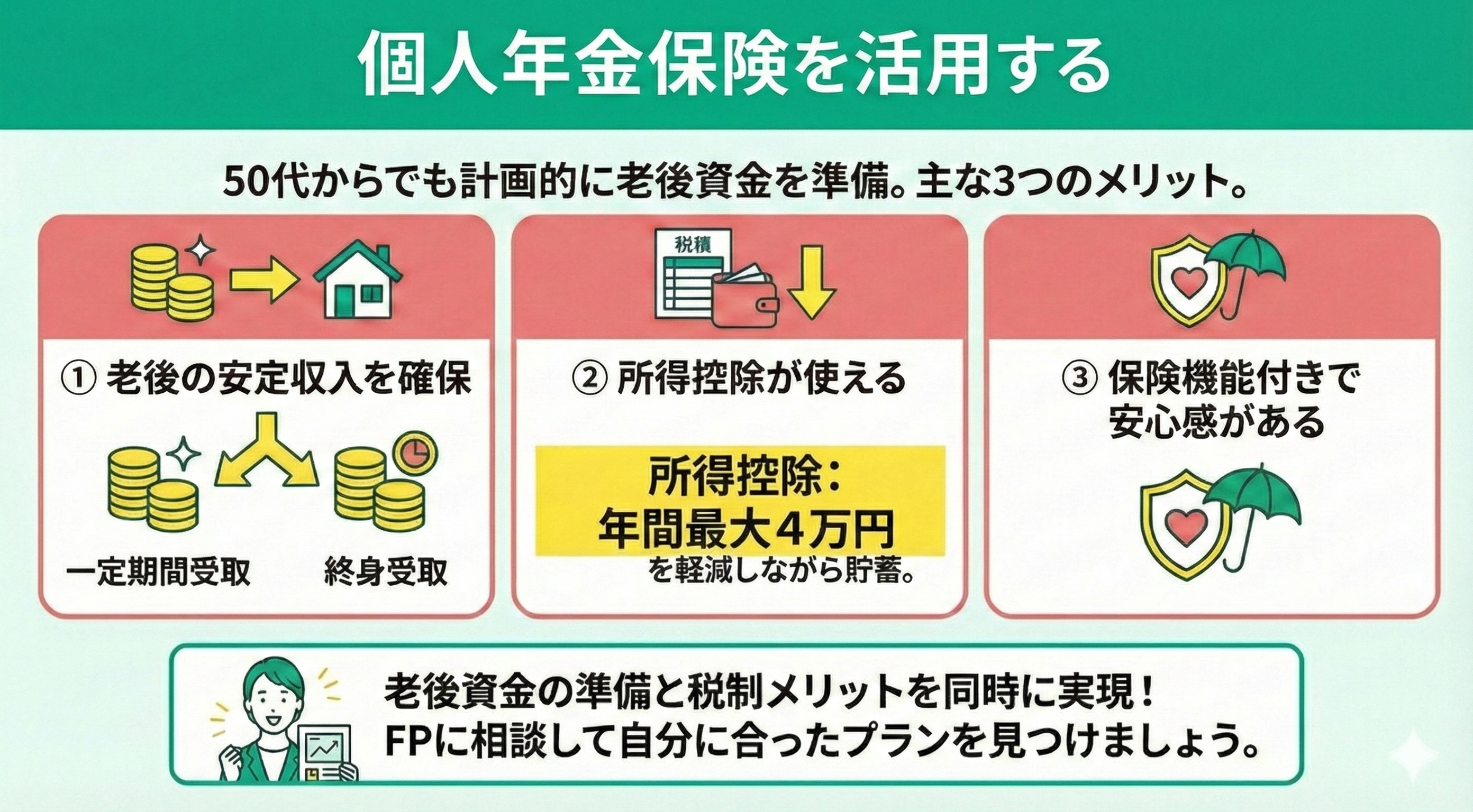 個人年金保険は、50代からでも老後資金を計画的に準備できる方法の一つで、主なメリットは以下の3点です。