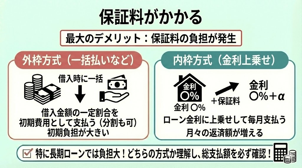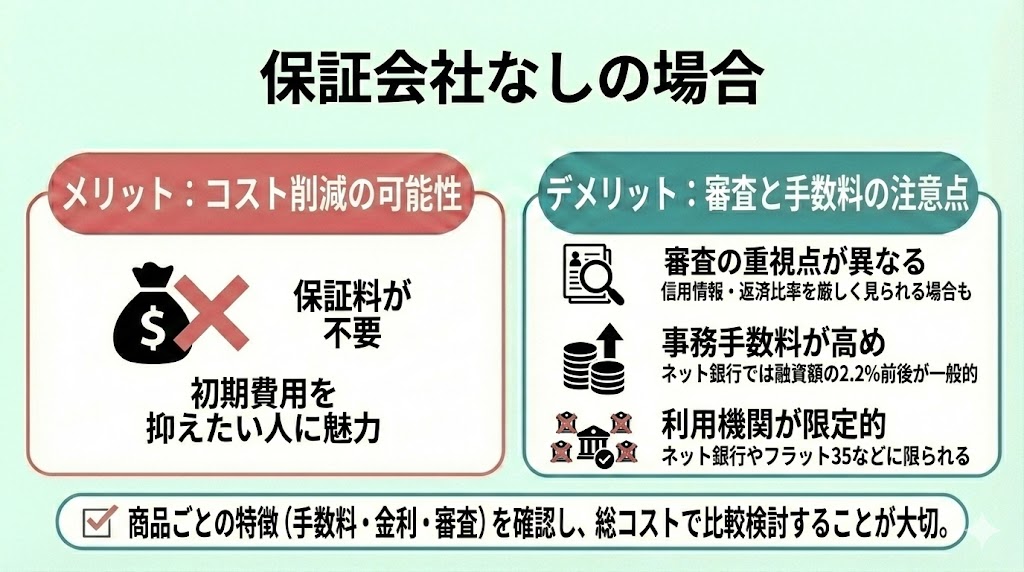 一方で、審査基準が厳格になりやすい分、保証料が比較的安く設定されていることが多いというメリットもあります。
