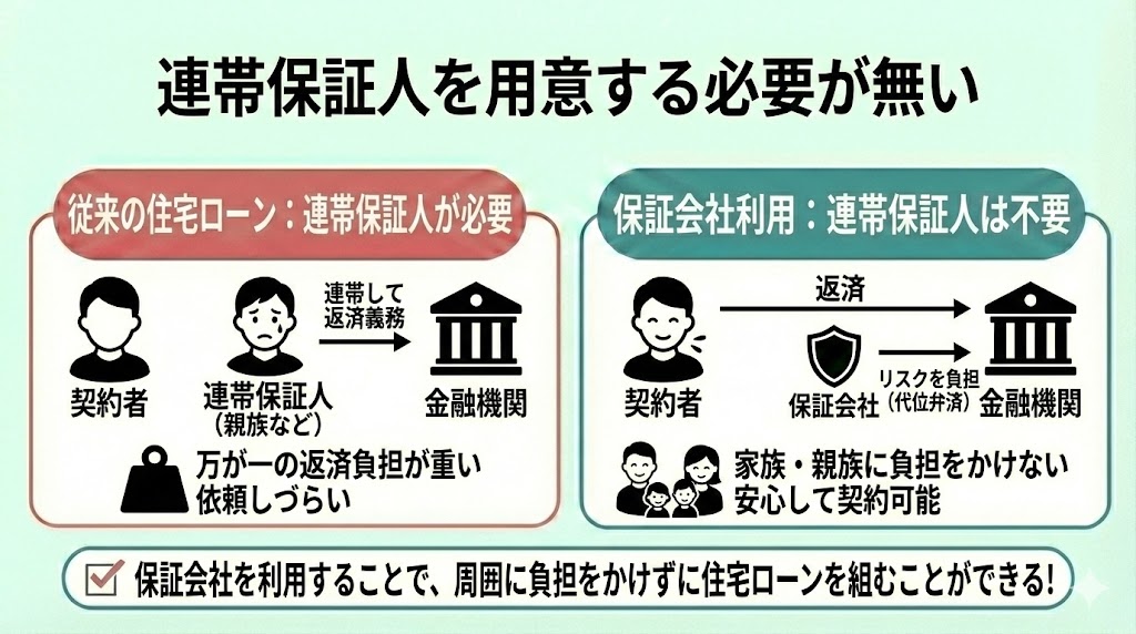 住宅ローンで保証会社を利用するメリットは「連帯保証人を用意する必要が無い」点です。