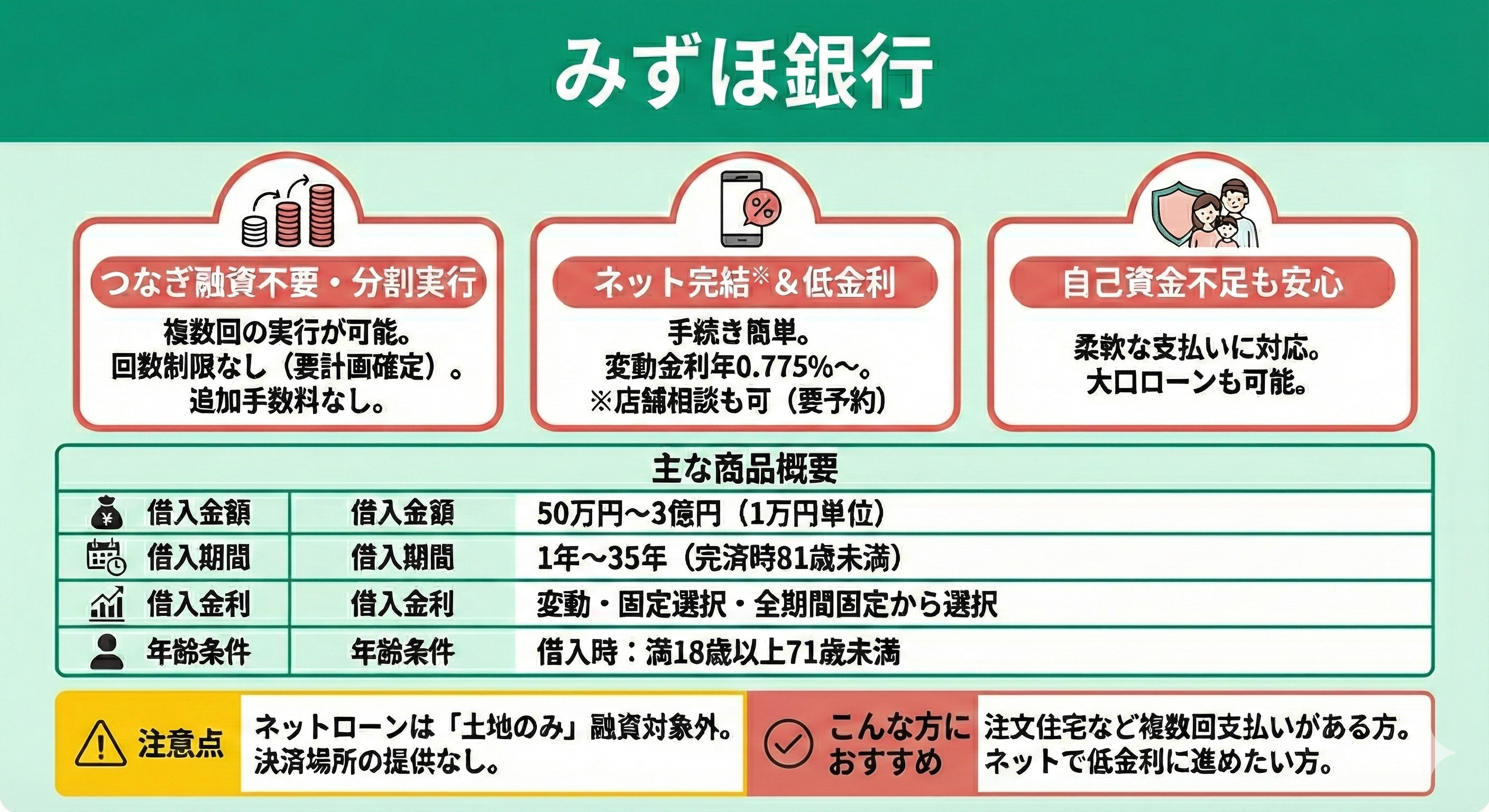| みずほ銀行 | 0.775%~ | 複数回 | 無料 | 可能 | ネットで手軽に進めたい人※ 手数料を抑えたい人 |