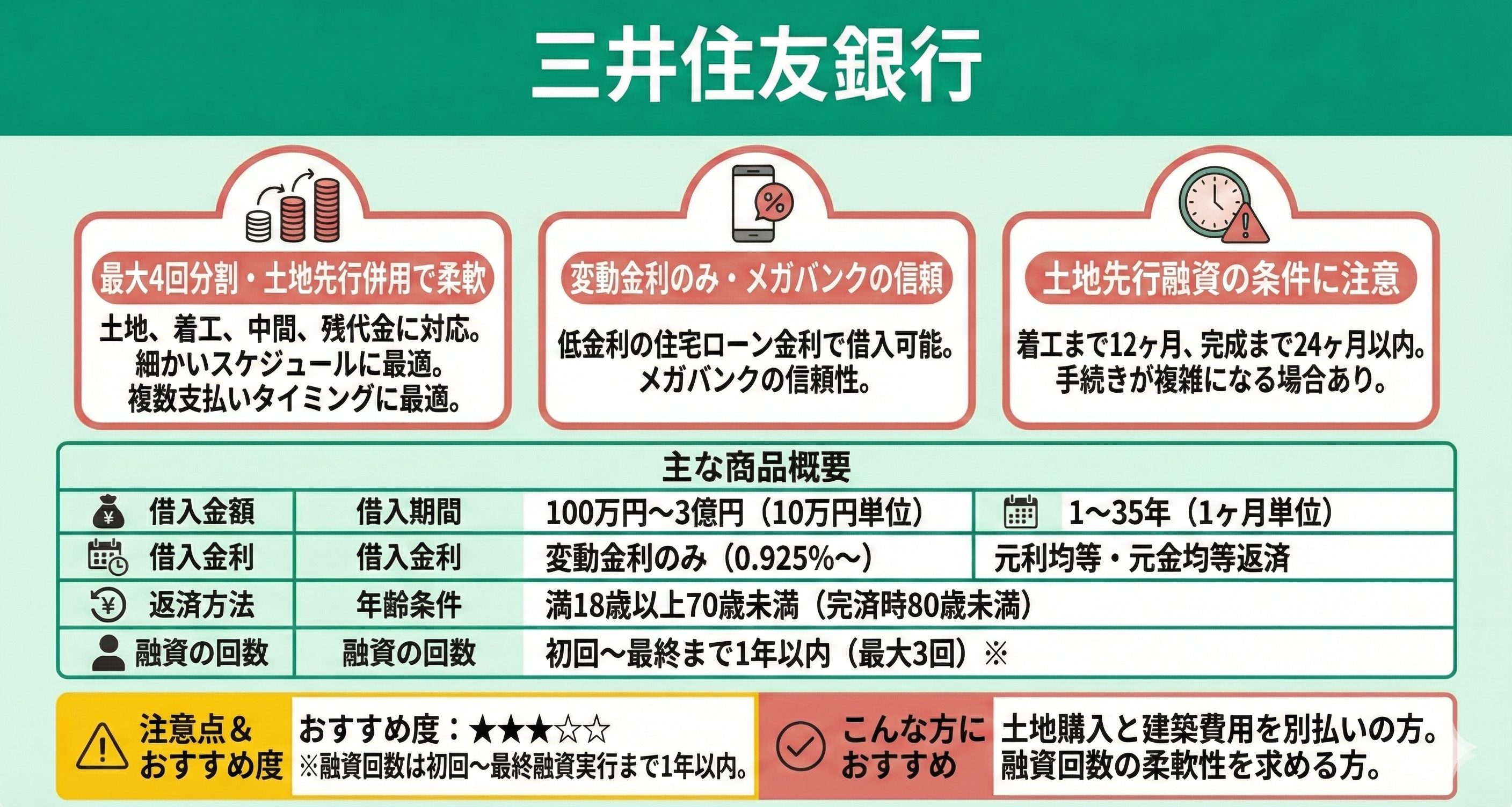 | ネット銀行 (ex.住信SBIネット銀行 土地先行プラン) | 0.65%~ | 2回まで (土地・建物完成時のみ) | 必要 | 可能 | ネット銀行の低金利を使いたい人 |