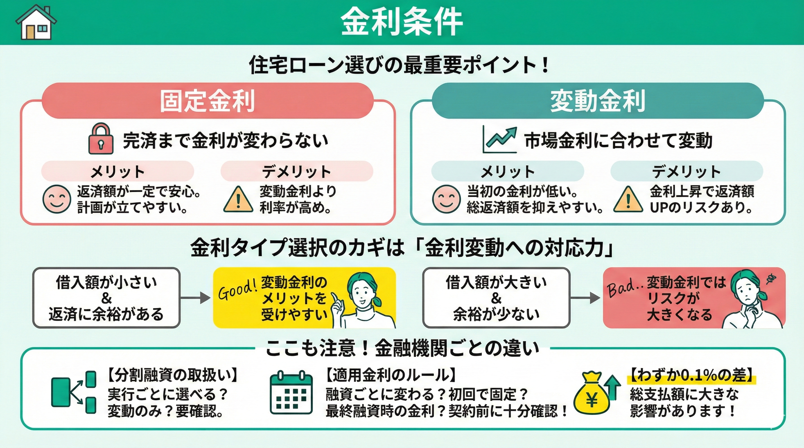 金利条件は、住宅ローン選びで最も重視すべきポイントです。金利タイプには「固定金利」と「変動金利」があり、それぞれ特徴が異なります。
