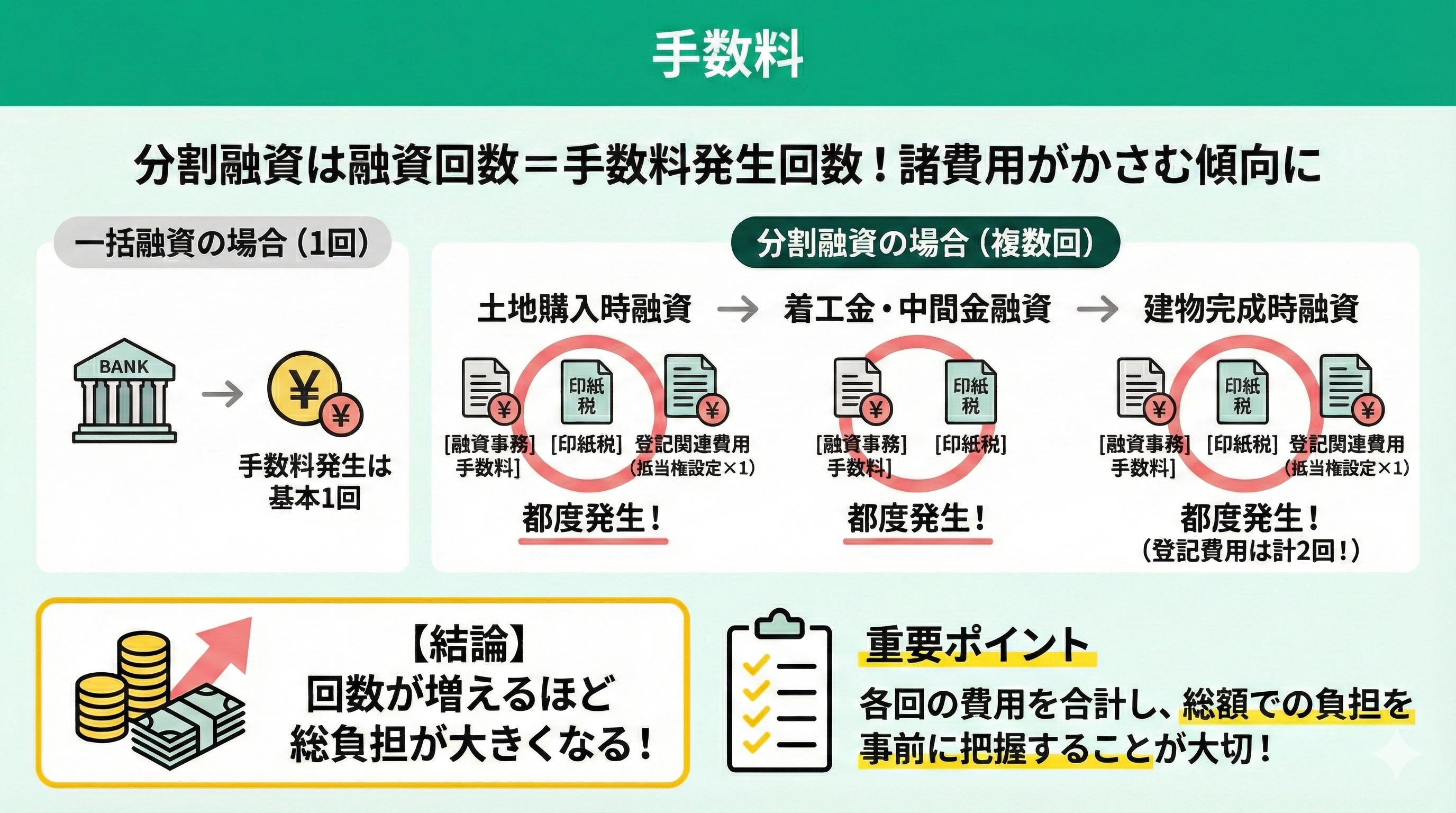 このように、分割融資では諸費用が増えやすいため、各回の融資に伴う費用を合計し、総額でどの程度の負担となるか事前に把握しておくことが大切です。