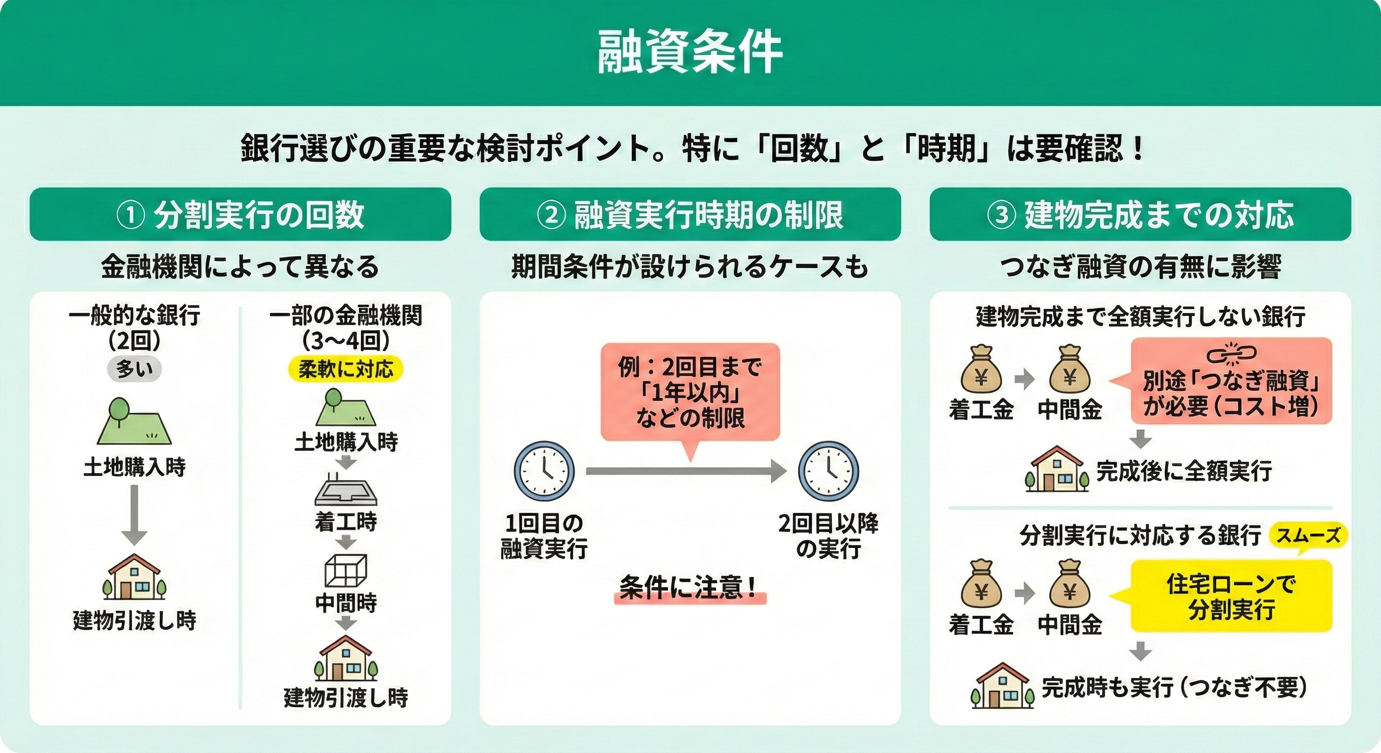 融資条件も銀行ごとに差があり、分割融資に対応する銀行を選ぶ際の重要な検討ポイントです。特に、何回に分けて融資できるか(分割実行の回数)や各回の融資実行時期に関する条件は銀行によって様々なので、事前によく確認しましょう。