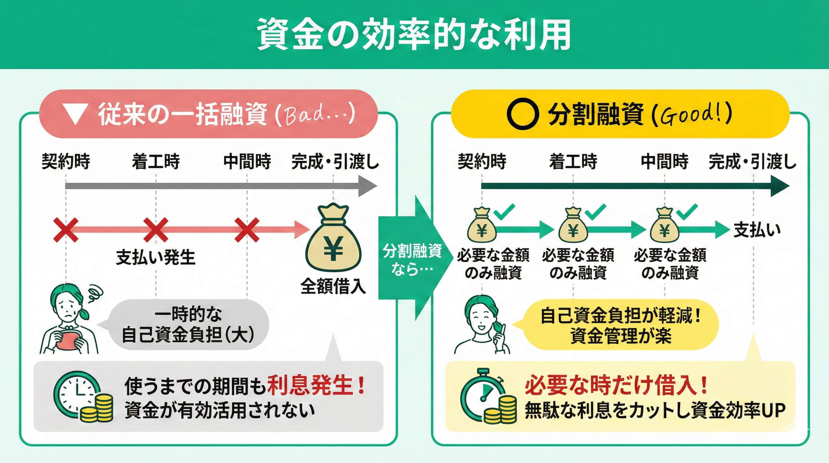 全額を一度に借りてしまえば、実際に使うまでの間もそのお金に対して利息が発生し、資金が有効に活用されないおそれがあります。分割融資なら、無駄な利息負担を省き、必要な資金だけで済むため資金効率が格段に高まります。
