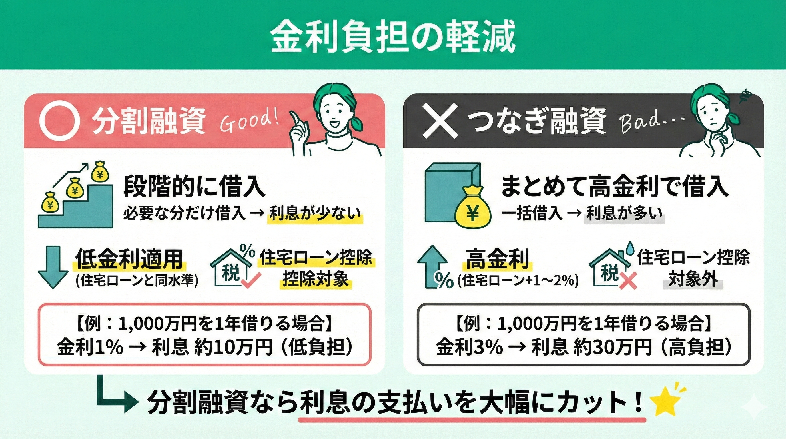 1,000万円を1年間借りる場合、金利1%なら利息は約10万円ですが、金利3%では約30万円にもなります。低金利の分割融資なら前者の水準で済みますが、高金利のつなぎ融資を利用すると後者の利息負担が生じるというわけです。