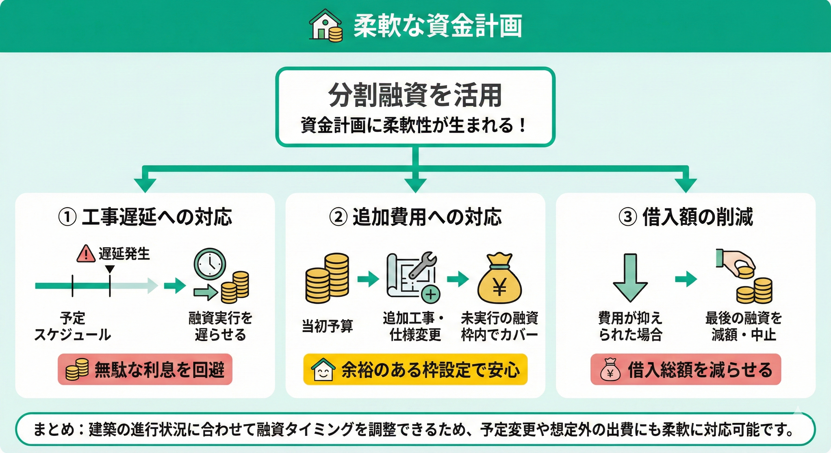 例えば、建築工事の進捗が予定より遅れた場合でも、次の融資実行をそのスケジュールに合わせて遅らせることができます。資金を前倒しで借りてしまっていると、その遅延期間中も利息を払い続ける必要がありますが、分割融資であれば必要になるまで借りずに済むため無駄がありません。