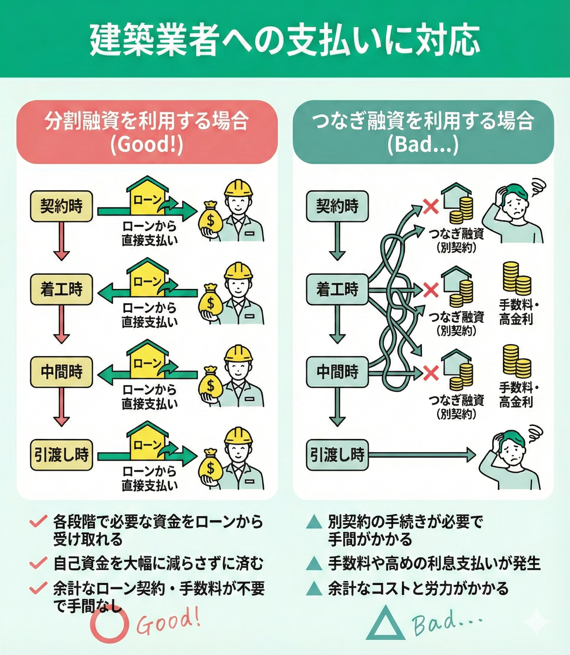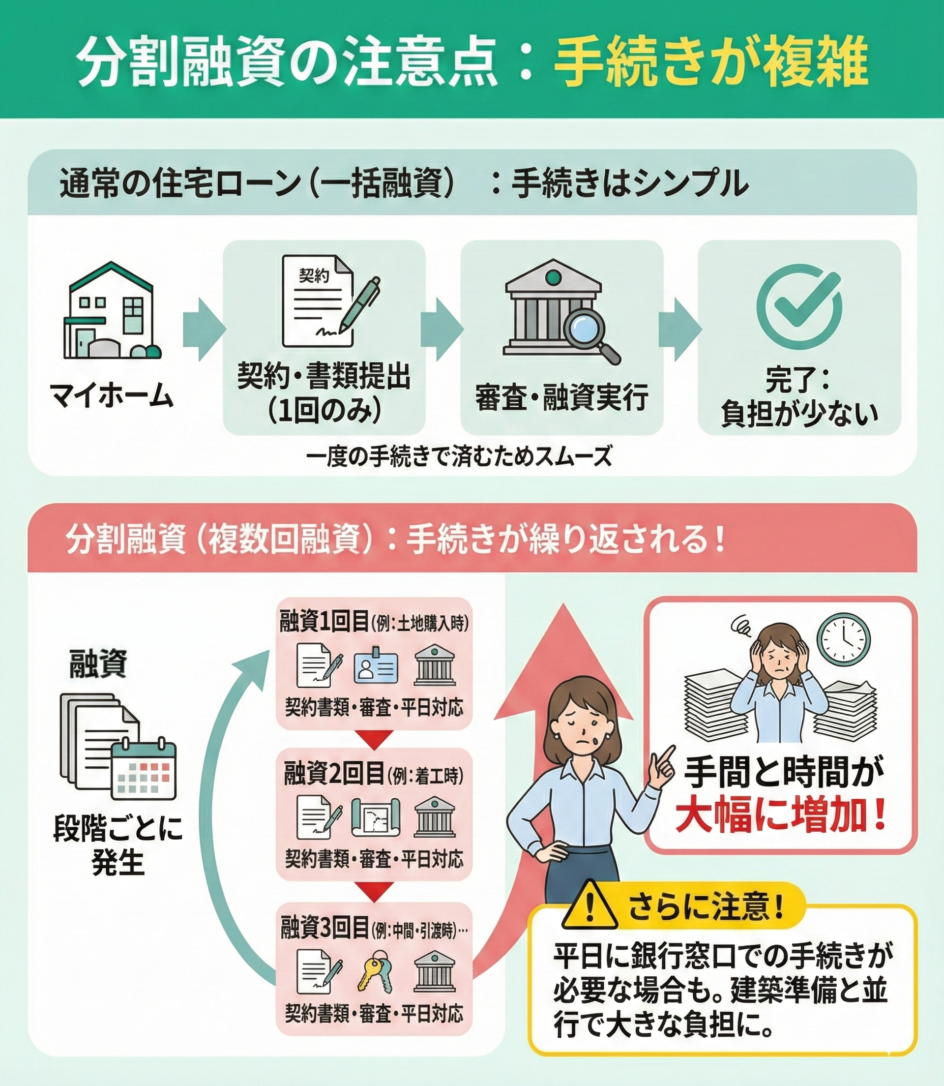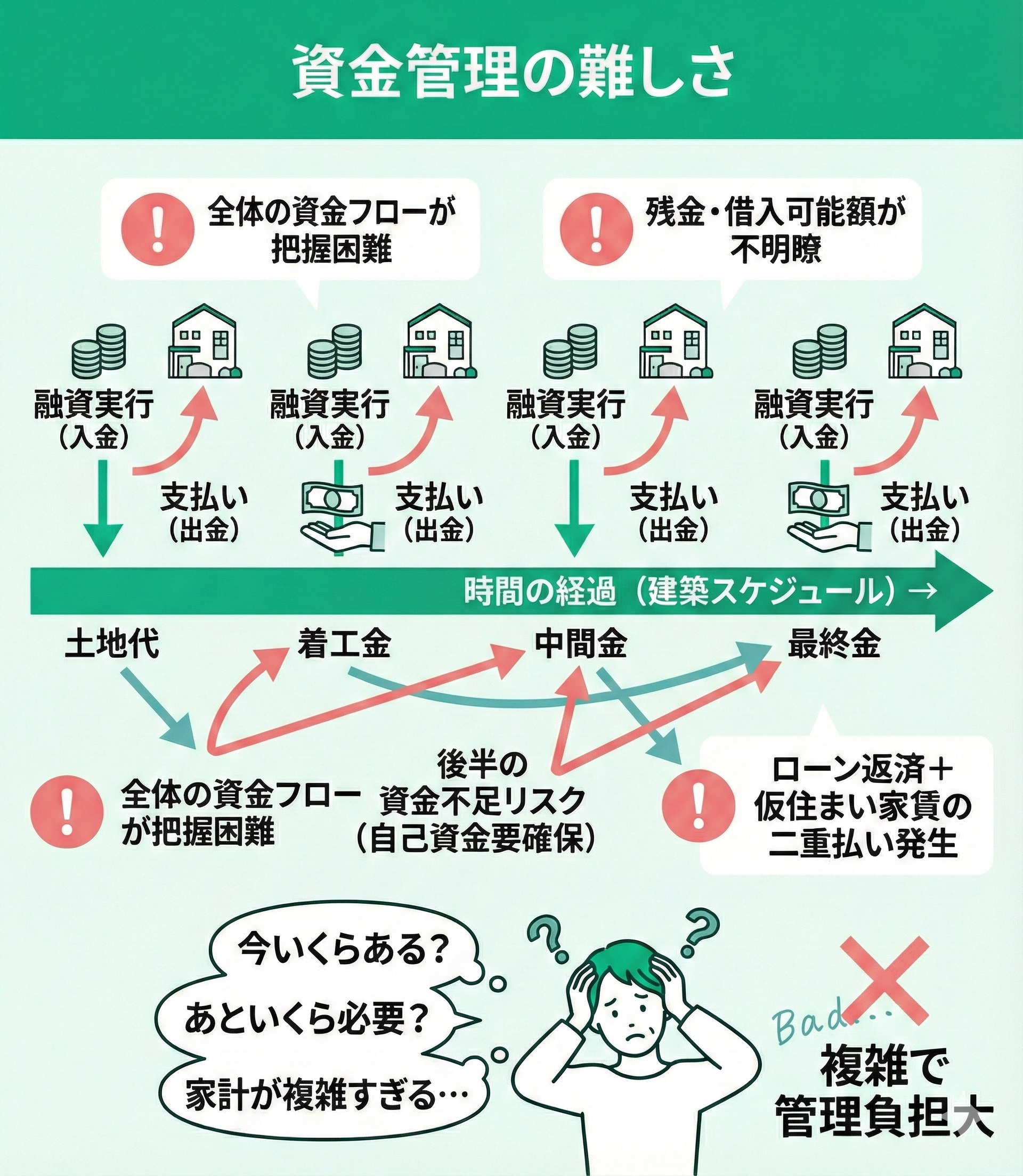 また、複数回の融資や支払いがあることで、家計の出入りが複雑になりやすいです。融資実行のタイミングによっては、住宅ローンの返済と仮住まいの家賃などが一時的に重なり、月々のやりくりが苦しくなる可能性もあります。