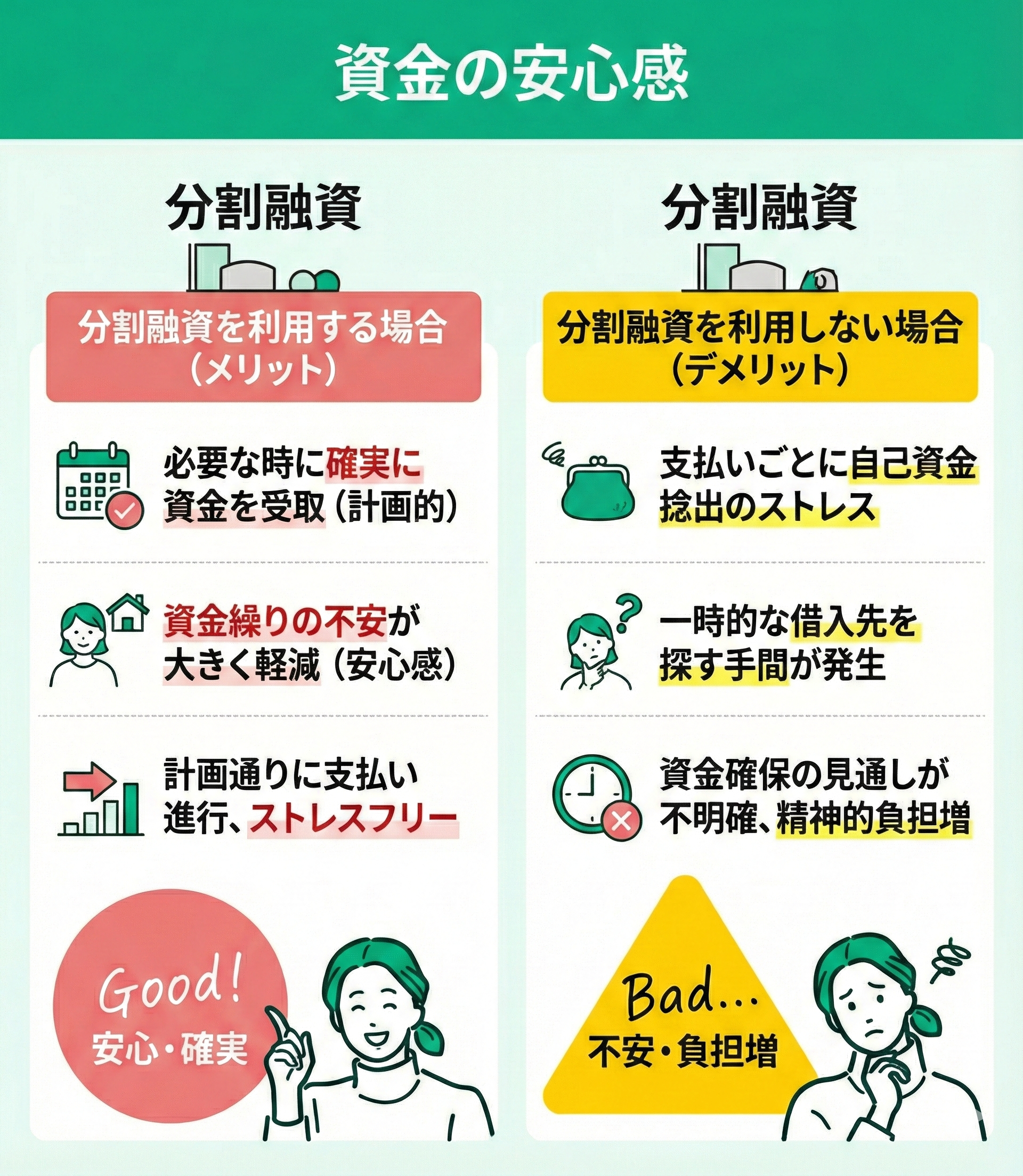 分割融資の利用は、資金面での安心感を生み出します。必要な時に必要なだけの資金を確実に受け取れる仕組みのため、資金繰りに対する不安が大きく軽減されるからです。実際「一度に高額なローンを組むのが不安」という方にとっても、分割融資は安心な選択肢となります。