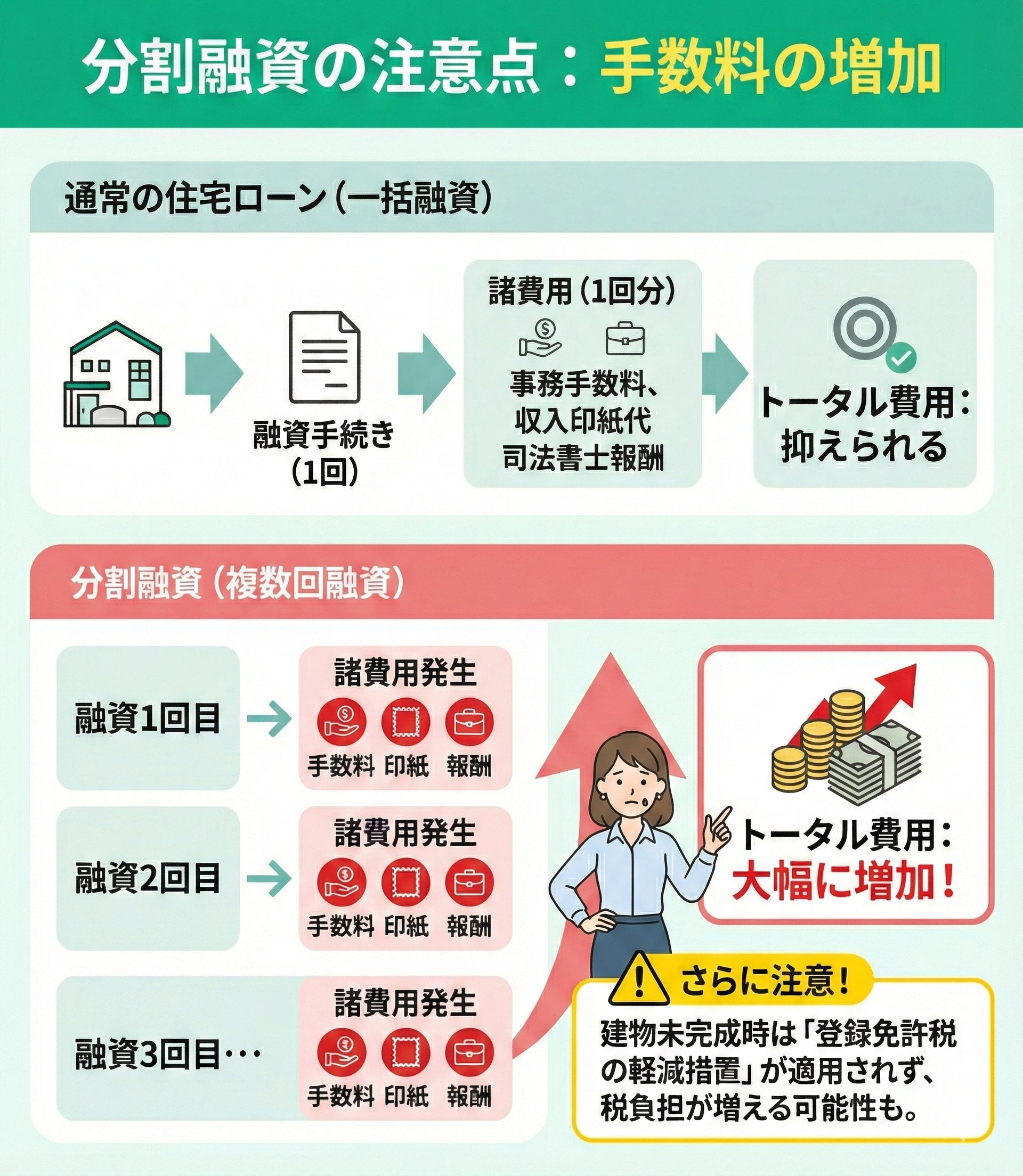 本来1回の融資で済む費用が重複して発生するため、トータルの負担は無視できません。さらに、初回の融資実行時に建物が未完成だと、本来受けられるはずの登録免許税の軽減措置が適用されず、税負担が増える可能性もあります。
