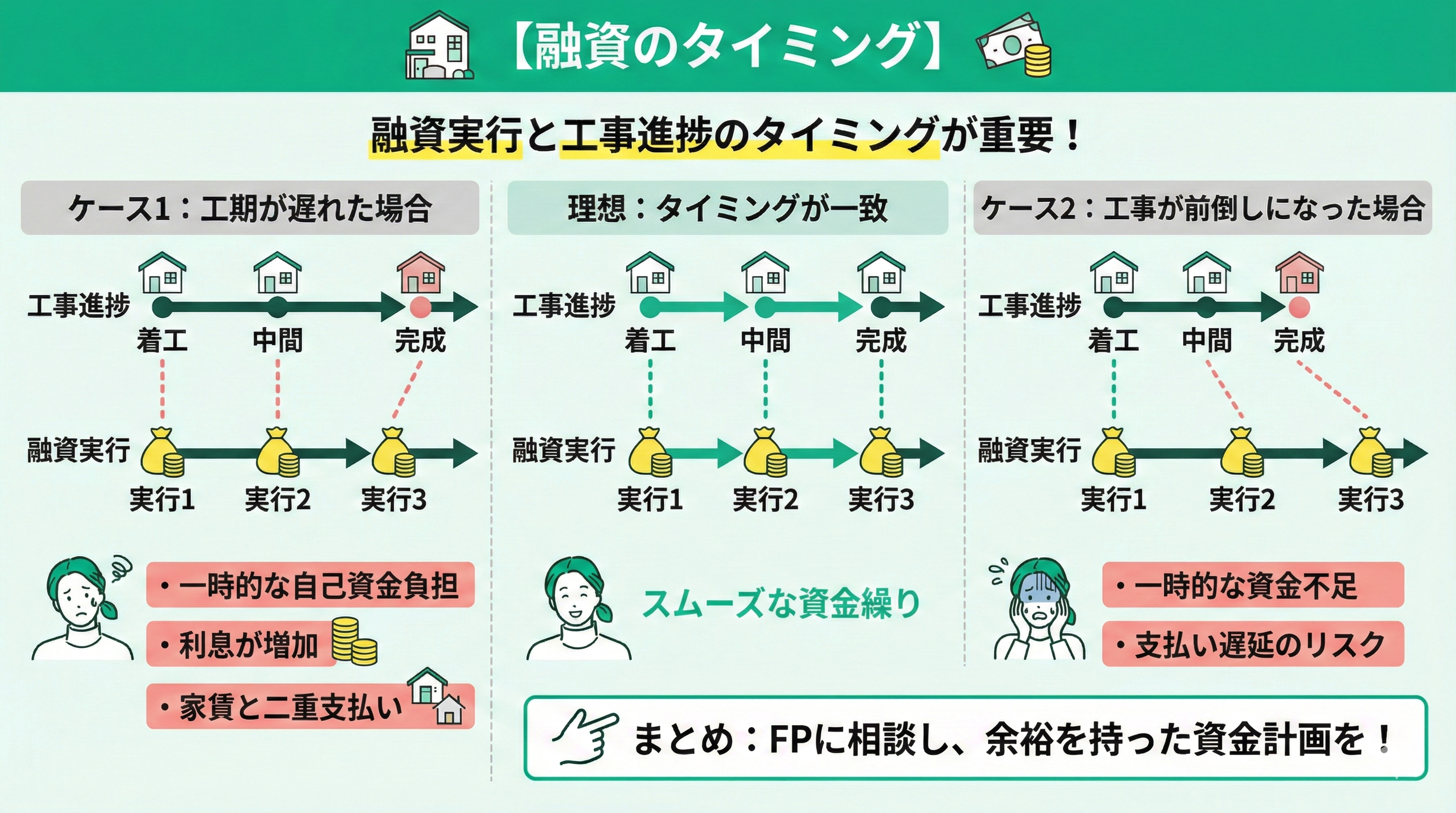 逆に、工事が順調に進み支払いタイミングが前倒しになったのに融資実行が間に合わなければ、一時的に資金不足に陥るリスクがあります。